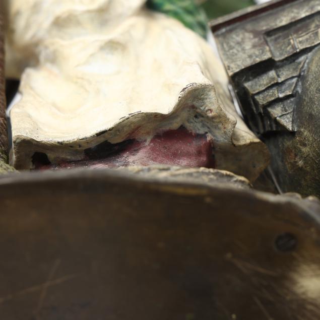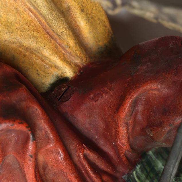 Overall good condition; scattered areas of age crazing and rubbing to paint; a few small areas of paint loss; underside with scratches, slight bend to rifle.