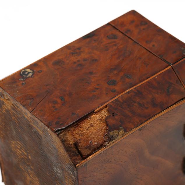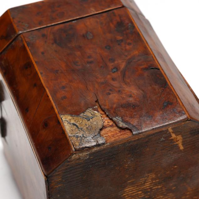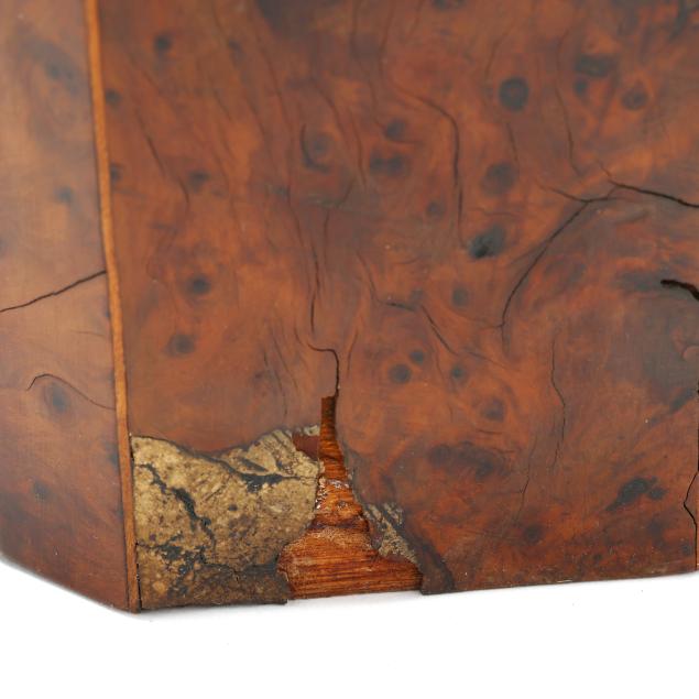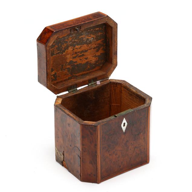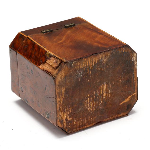Private Collection, Greensboro, North Carolina Some areas of veneer loss, most noticeably to back and one side; losses to tin lining; mis-shaping to ring handle.