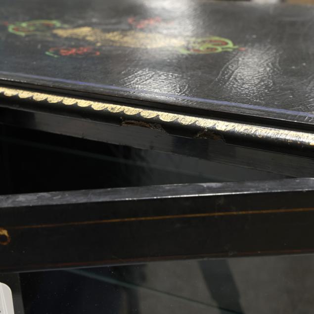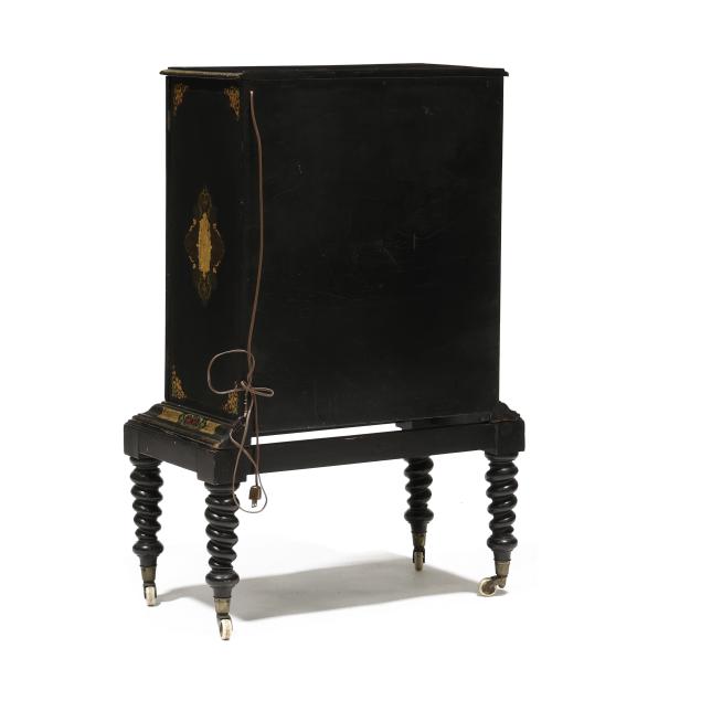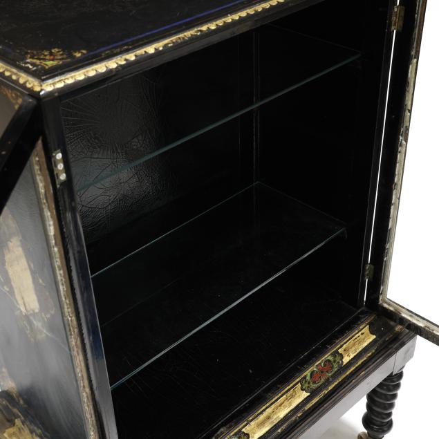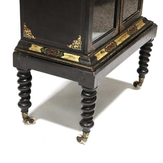 Late 19th century, two part form, black lacquered field with red and green paint and gilt highlights, two hinged glass panel doors, two glass shelves to the interior, set on a conforming stand with barley twist legs on porcelain casters.