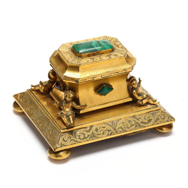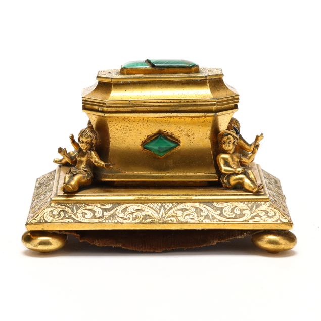 Likely French or Russian, third quarter 19th century, unsigned, gilt brass, cast in the Baroque style, featuring a central chest form inkwell with hinged lid and removable inkwell, set with malachite and garnet cabochons alongside engraved Rococo style scrollwork, flanked by four seated children stationed at the corners, and supported atop an engraved beveled plateau, velvet and plaster underside, raised on four cast toupie feet.