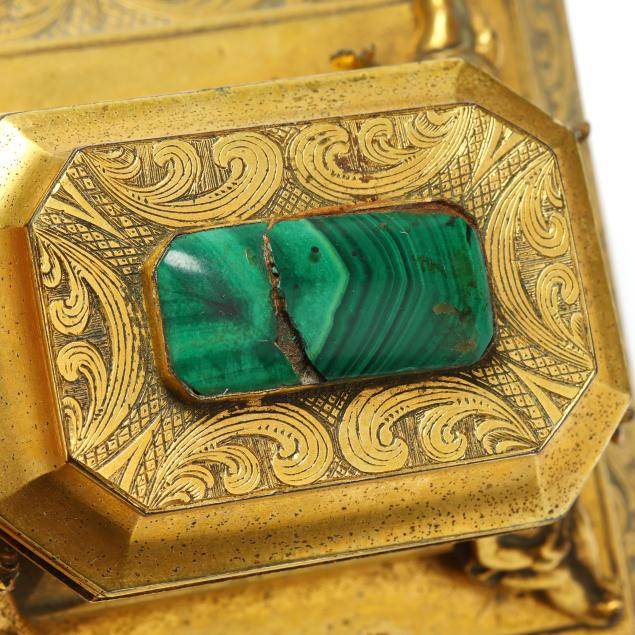 Crack to malachite cabochon on lid and with associated old adhesive residue; lid does not close completely flush to the base; looseness to mount of one child; scattered areas of gilt rubbing.
