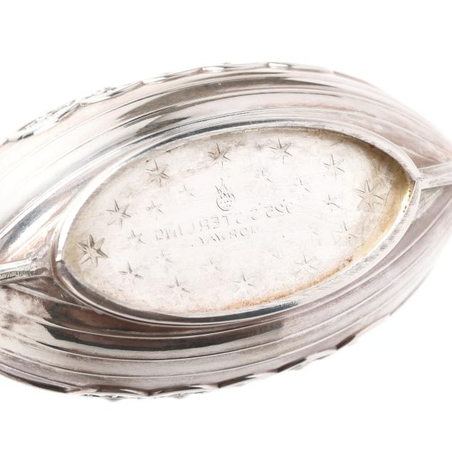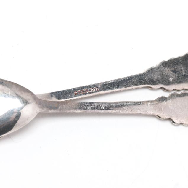 Late 20th century, sterling silver, Dragestil style with gold wash interiors, paired with salt spoons marked "Sterling," fitted with inserts, not monogrammed.