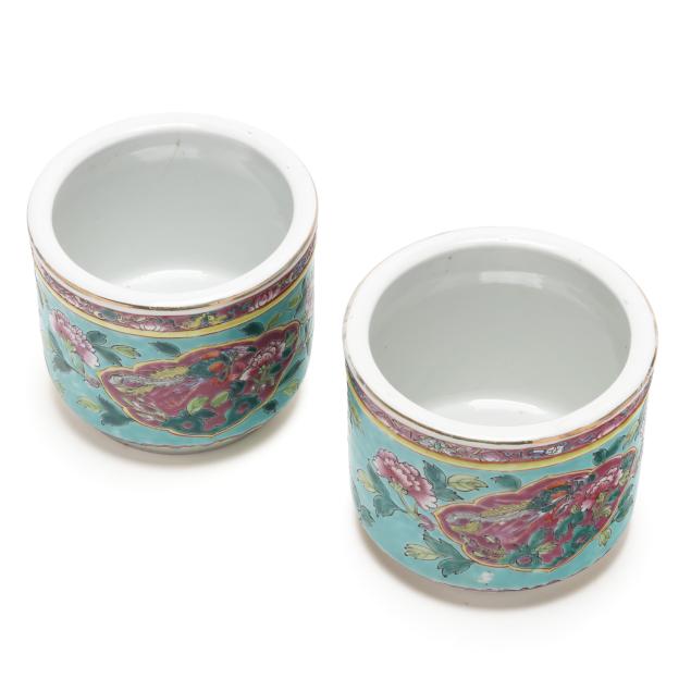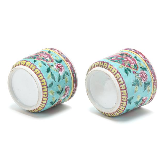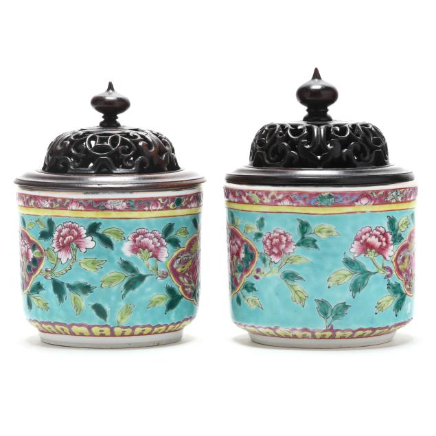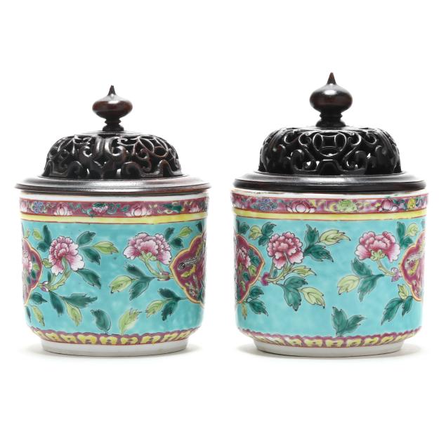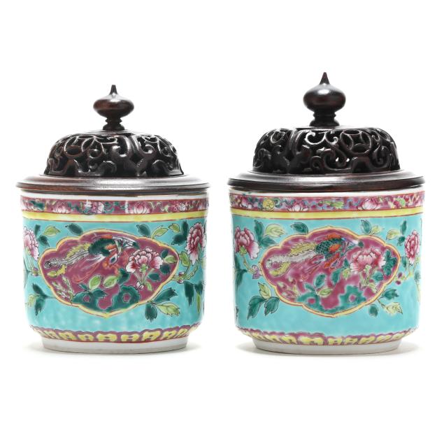 Qing dynasty (1644-1912), late 19th century, porcelain hand-painted in rich enamels with shaped reserves populated with phoenix and peonies, exterior turquoise ground, patterned bands below rim and above foot, with later carved wood reticulated covers featuring scrolling tendrils and coin motifs.