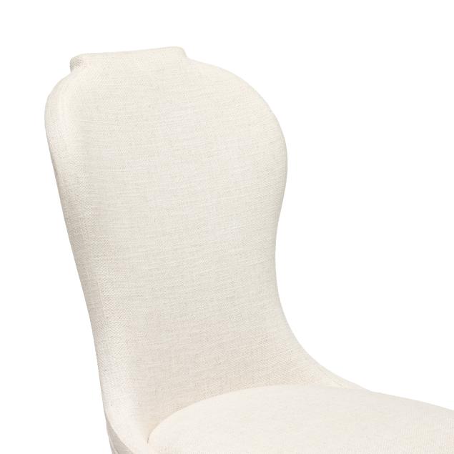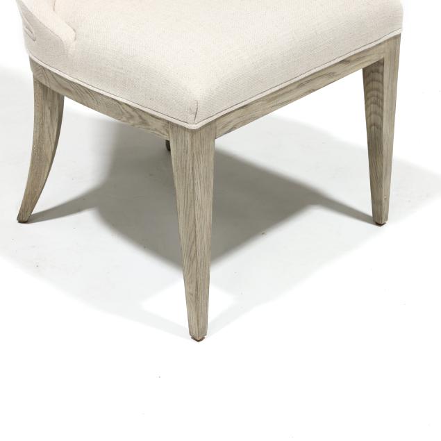 Contemporary, ivory colored woven over upholstered back and seat with white washed oak tapered legs, labeled.