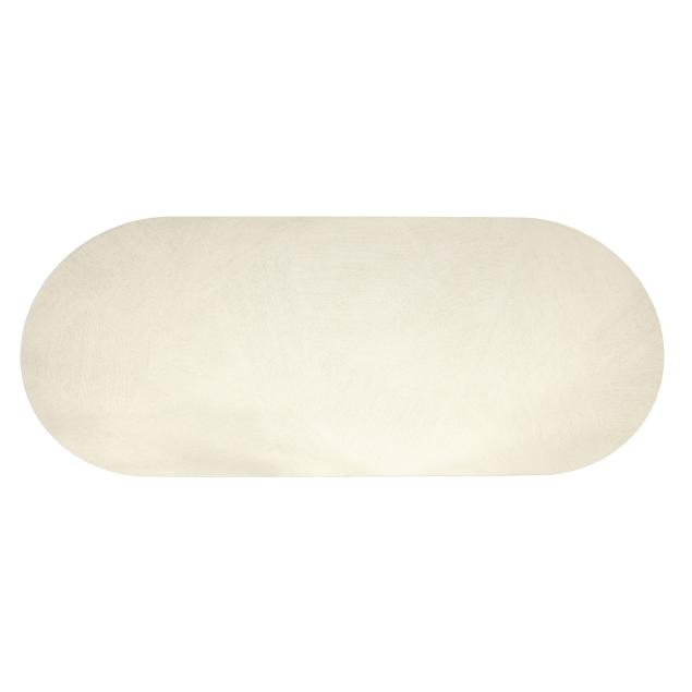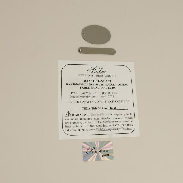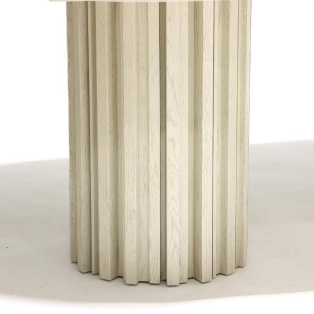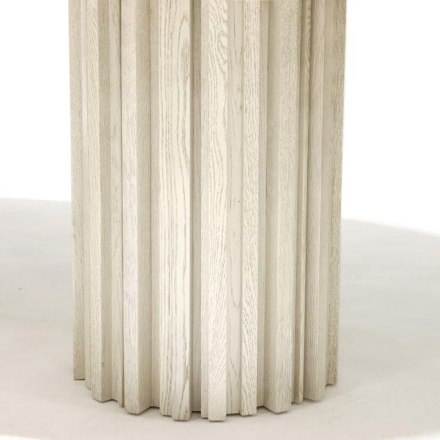 Contemporary, ecru finished oak, the oval top with geometric patterned grain veneers, deep fluted double pedestal supports, labeled.