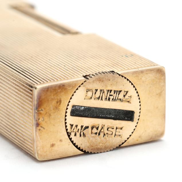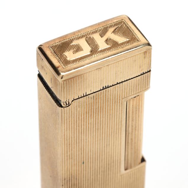 Rectangular reeded gold outer casing, "JK" monogram to top, marked "DUNHILL / 14K CASE" to the underside, the upper interior block beneath the lid stamped "LIC.U.S.A.PAT. / No 1657352."