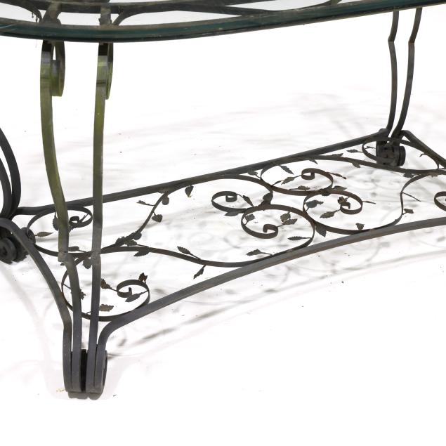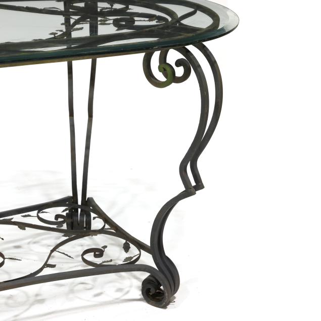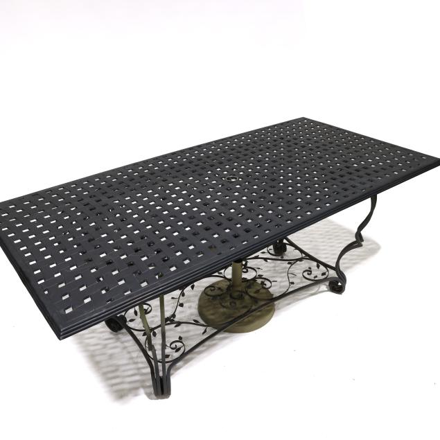 Late 20th century, oval iron table with oval beveled glass top in black paint with scrolled bold legs and foliate scroll upper and lower panels together with a later aluminum lattice rectangular top; one weighted umbrella stand and two umbrellas, unmarked.