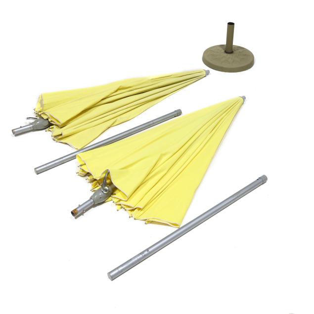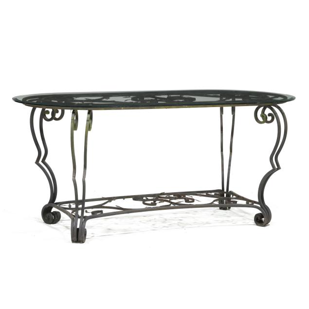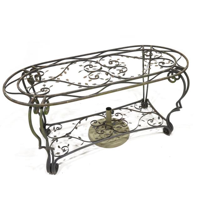 From the Collection of Jon and Mary Leadbetter, Chapel Hill, North Carolina Iron table with some paint loss and surface rust; spotting to fabric on umbrellas and areas of rust from outdoor use; umbrella stand with loose mount; later aluminum top which was custom set over the oval table to change the look of the table.
