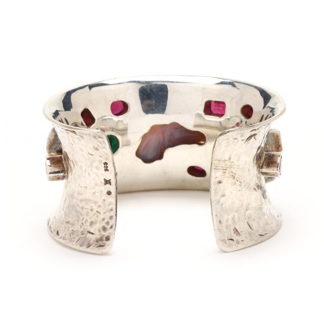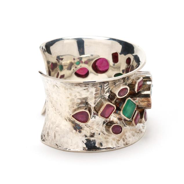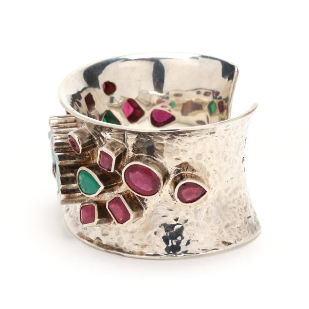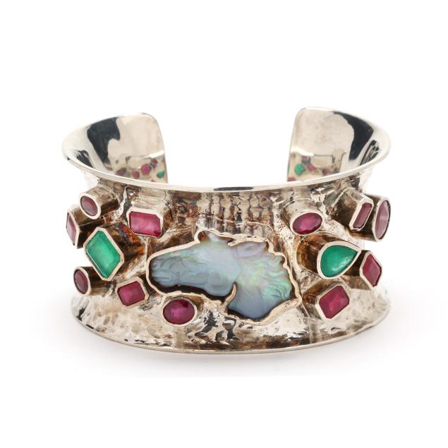 The wide cuff set to the center with a carved opal in the form of a horse head, in a conforming bezel, further set with oval cut, emerald cut, and pear cut rubies weighing approximately 22.0 total carats, and with an oval cut and emerald cut emerald weighing approximately 4.25 total carats, stamped 925 and with maker's marks.