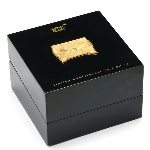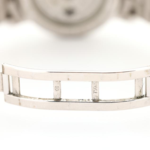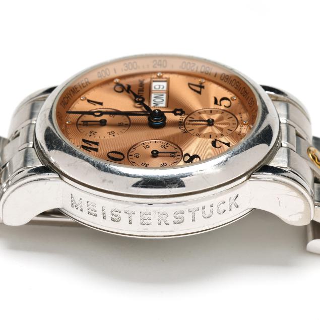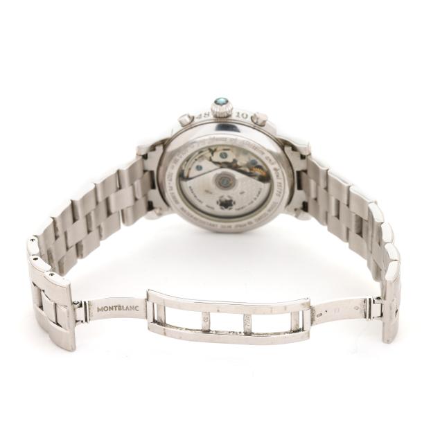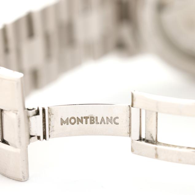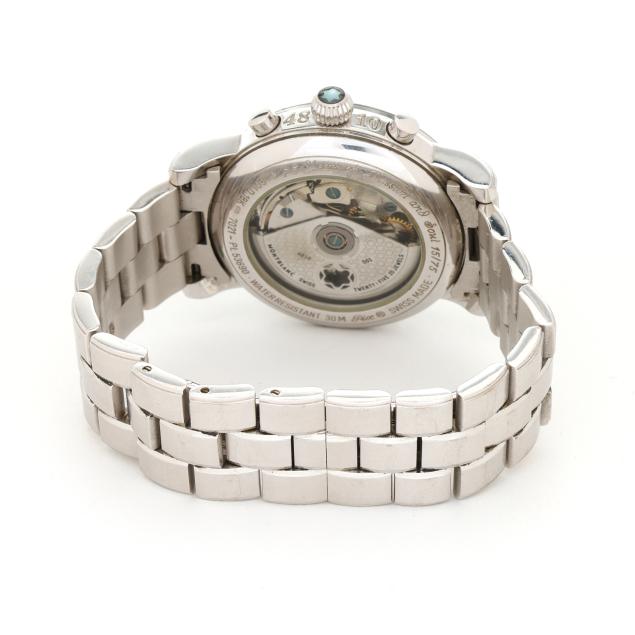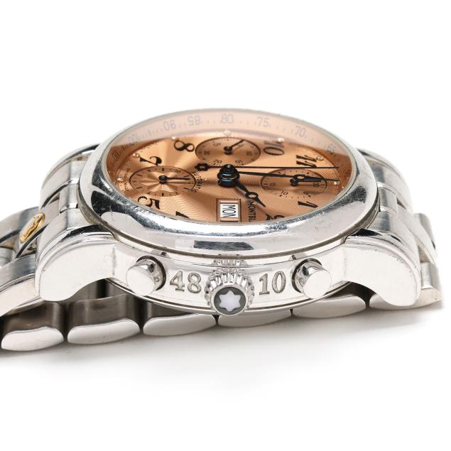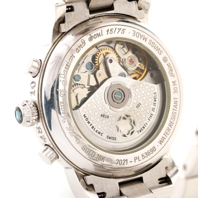 Automatic, Montblanc 4810/501, reference number 7021, serial number PL53690, limited edition number 15 / 75, the round white gold case with polished bezel, caseband engraved Meisterstuck / 4810, and applied Montblanc logo to crown, the signed rose-tone guilloché dial with black Arabic numeral and diamond hour markers, blued steel Breguet hands with Montblanc logo to chronograph second hand, subsidiary second dial at 9:00 hour, subsidiary chronograph dials at 12:00 and 6:00 hour, tachymeter chapter ring, and day/date window at 3:00 hour, the brushed white gold brick link bracelet with polished edges and applied gold Montblanc logo completed with a hidden butterfly clasp signed and stamped 750, the exhibition caseback numbered, engraved "75 Years of Passion and Soul 15/75", and stamped Gold 18K 750.