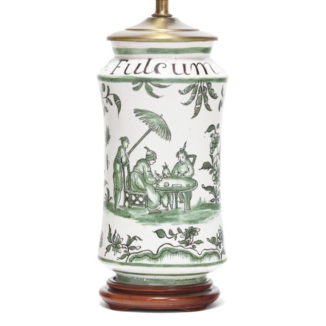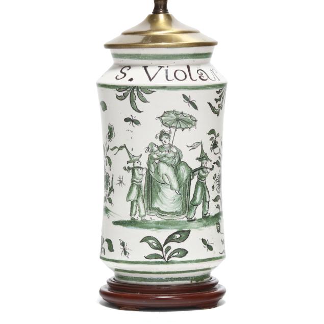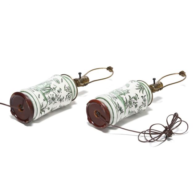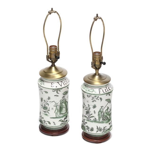 Mid- to late 20th century, likely Spanish, tin-glazed earthenware vase form table lamps decorated in green with Chinoiserie scene and flowers, one labeled "S. Violar" and the other "Fulcrum" to neck, with brass mounts and mounted to carved wood stands, includes two silk lined shades and metal ball finials.