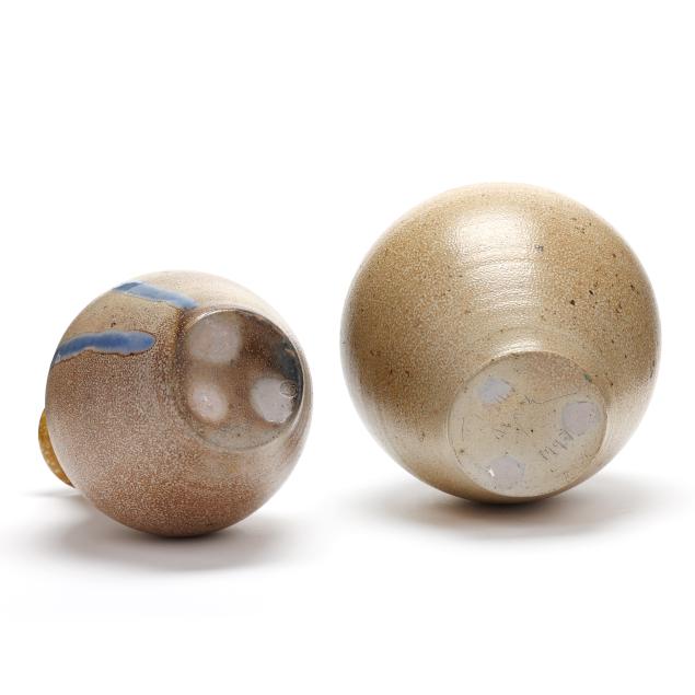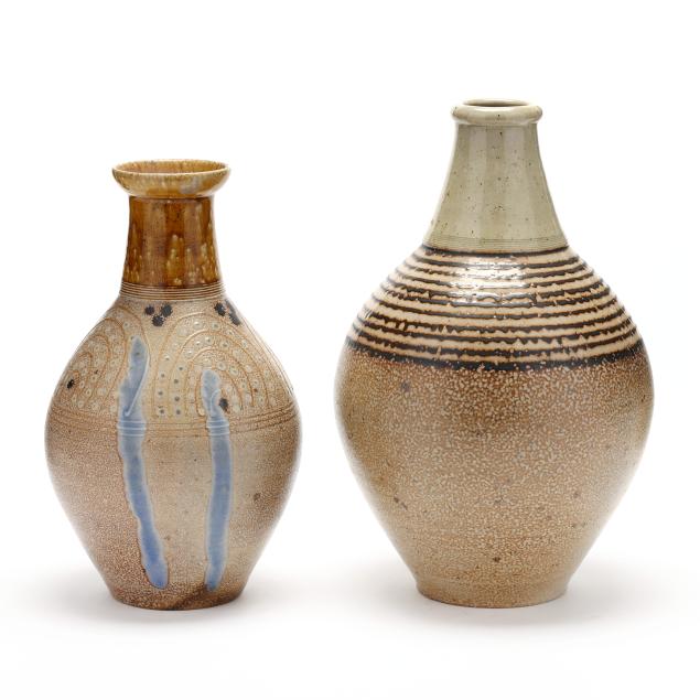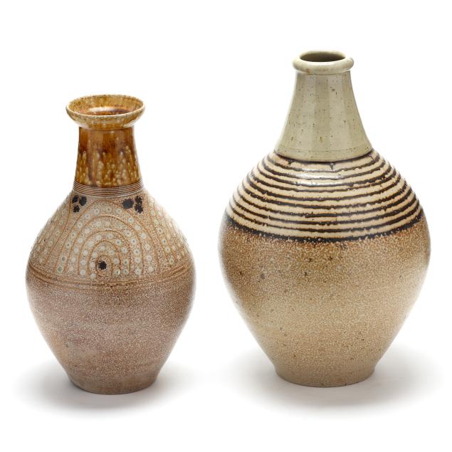Both ovoid forms with tall necks, the taller decorated with brown banding to shoulder and incised banding to neck, inscribed "Willie Mark / 1997" to underside (14 1/2 x 9 x 9 in.), the shorter with applied banding and geometric decoration to shoulder, incised banding to neck, and two blue glass runs to body, stamped with the artist's cipher to underside (12 3/4 x 7 x 7 in.).