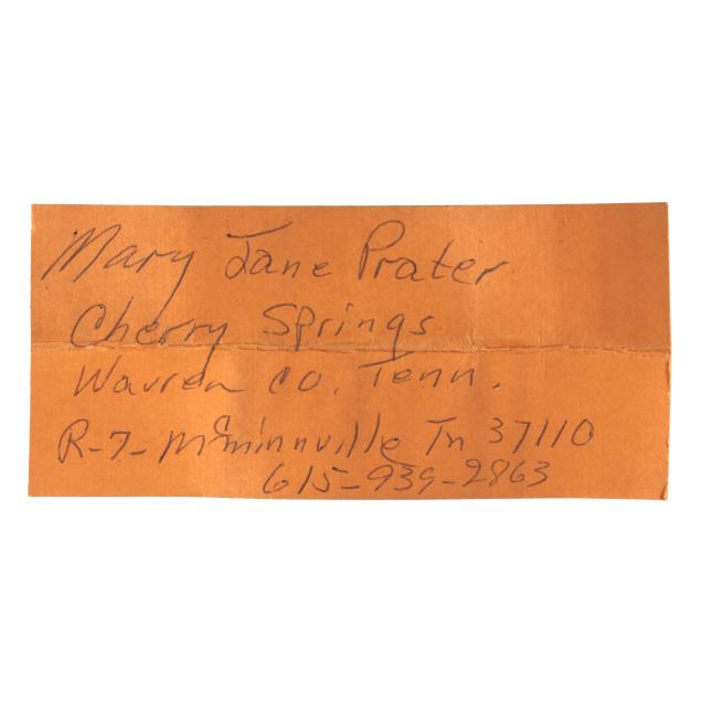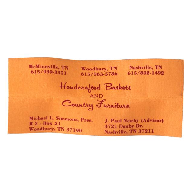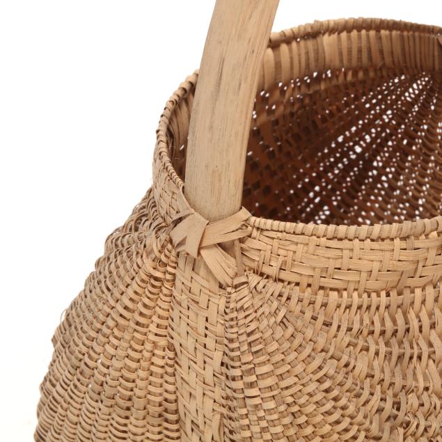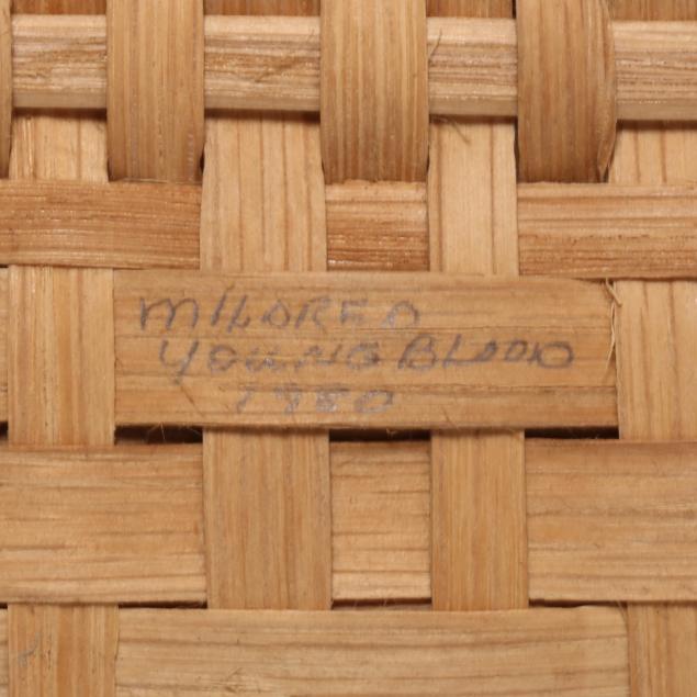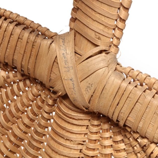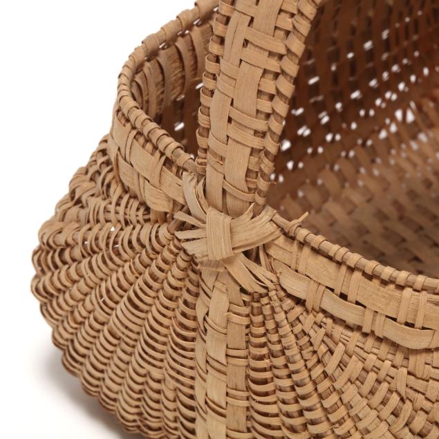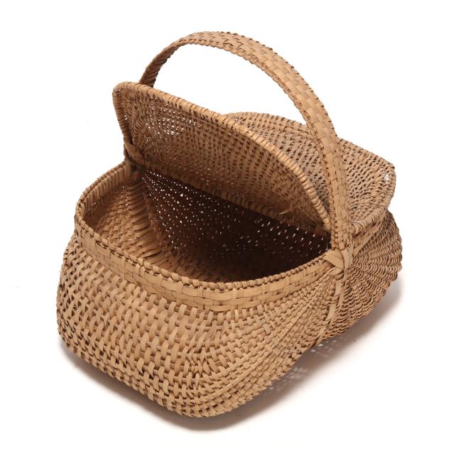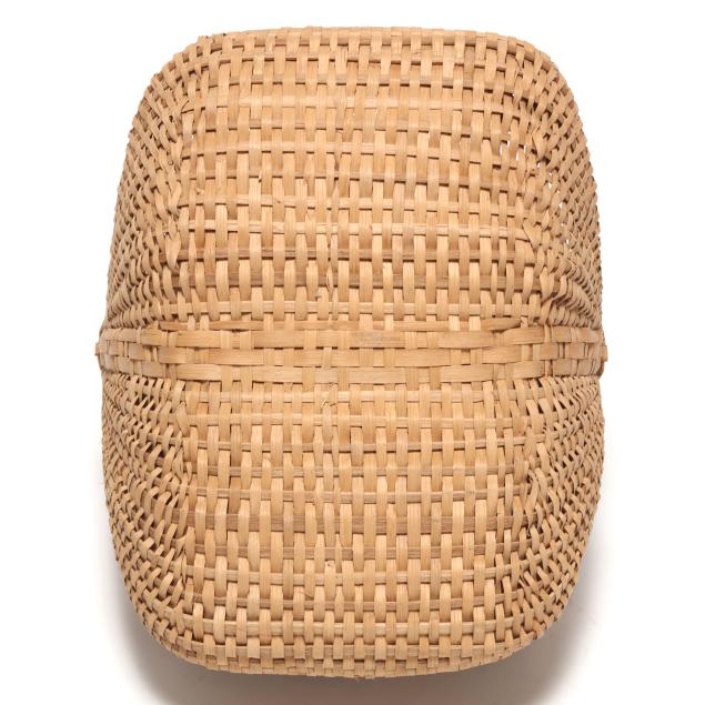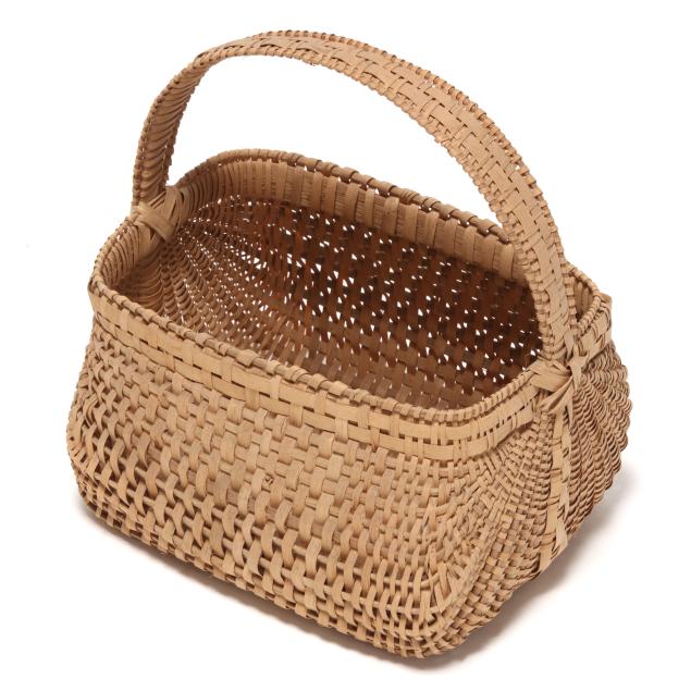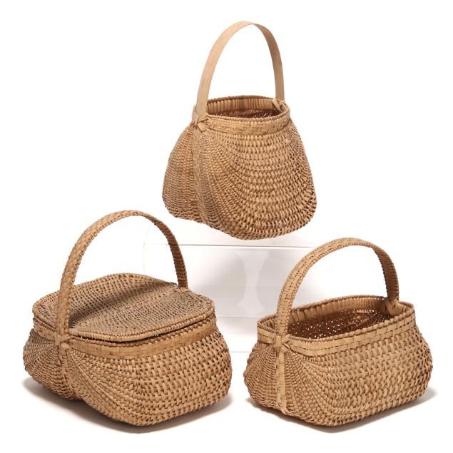 1980s, woven in white oak splints, each featuring a webbed rim weave finished with the regional "X" and bar tie at the handle juncture, the first of tall buttocks form with bentwood handle, retaining card to interior indicating maker "Mary Jane Prater / Cherry Springs / Warren Co. Tenn. / R-7-McMinnville, Tn 37110 / 615-939-2863" (19 x 11 1/2 x 10 in.); the second a buttocks picnic basket form with woven handle, pencil signed and dated to the underside "Mildred / Youngblood/ 1980" (16 x 15 x 13 in.); the third basket with rectangular rim beneath a woven handle, pencil signed and dated to the interior handle juncture "Mildred Youngblood / 1982" (14 x 13 x 10 in.).