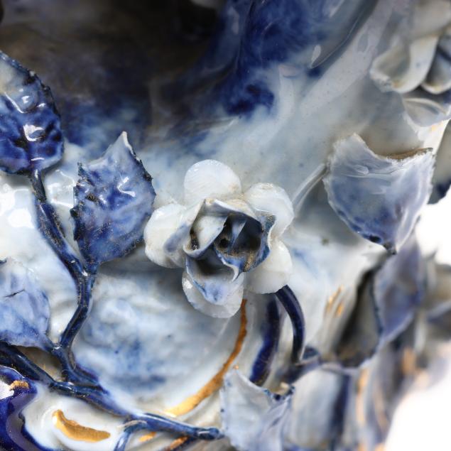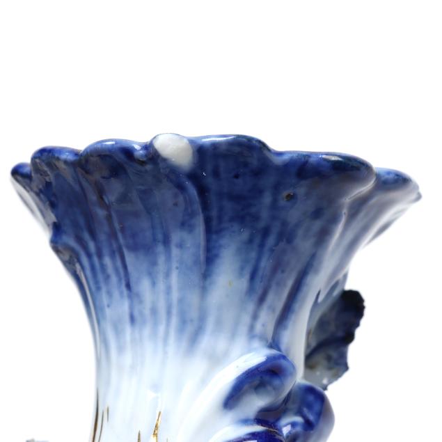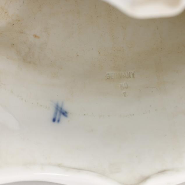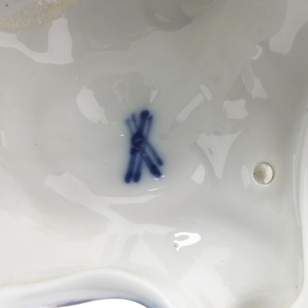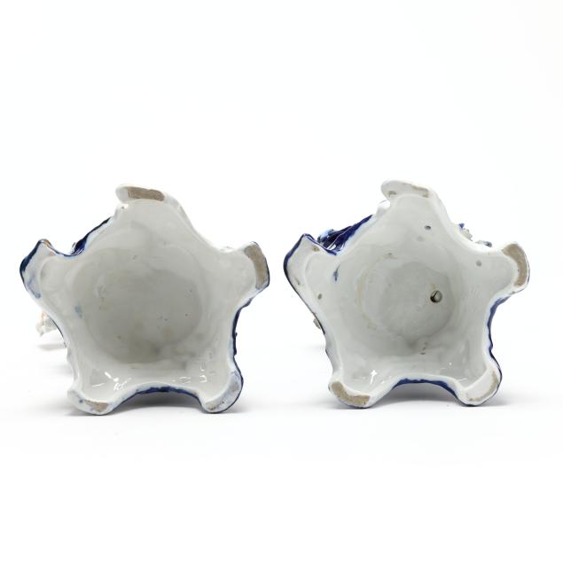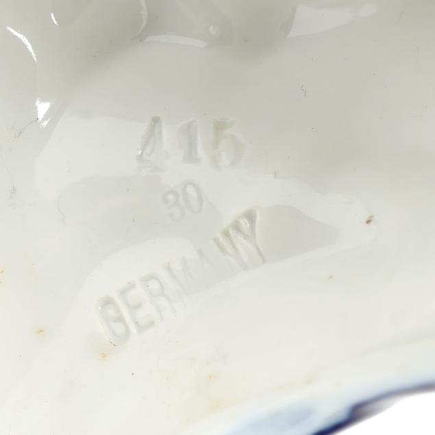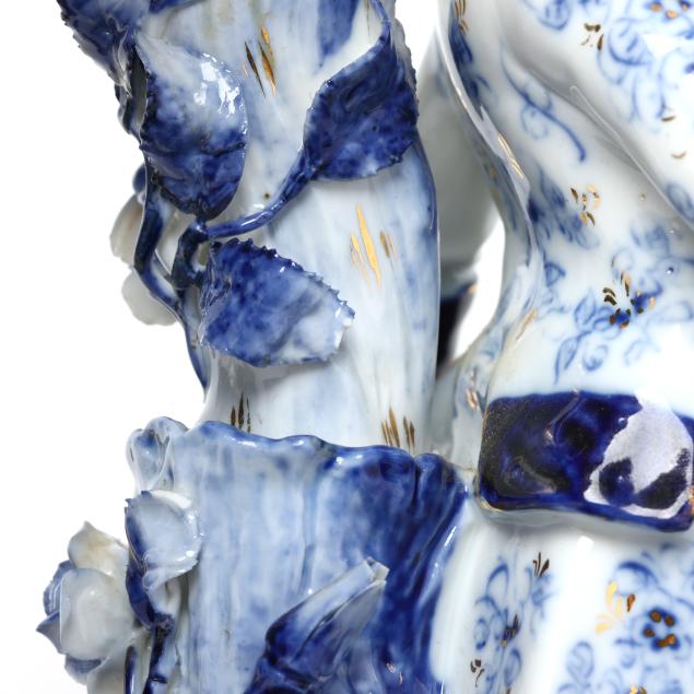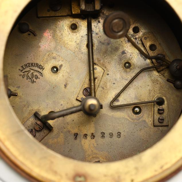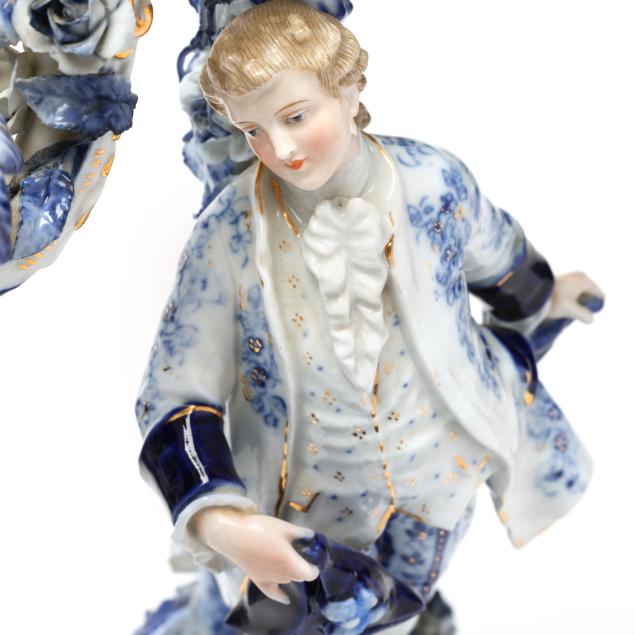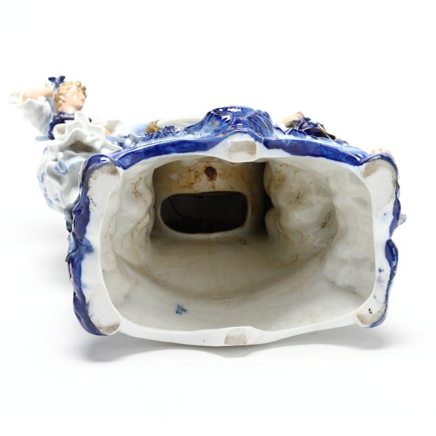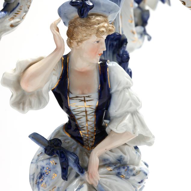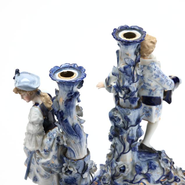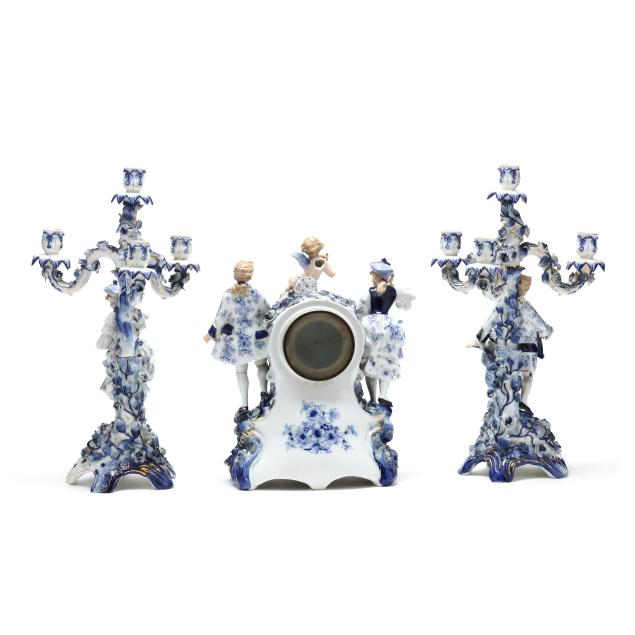 Germany, late 19th century, painted blue and gilt porcelain, comprising a mantel clock depicting a courting couple and cherub, framing a round hand-painted dial bearing signature "Tiffany & Co. / New - York," the brass dual train 8-days movement signed "Lenzkirch" and numbered "764298," striking on a bell, within a Rocco style floral case with diapered latticework; together with a pair of four light candelabra, each a two part figural form, supporting four branch arms and standing on conforming rocaille five footed scrollwork base. All pieces marked with 1865-1907 underglaze blue double cross mark, and stamped "GERMANY" with serial numbers to the undersides.