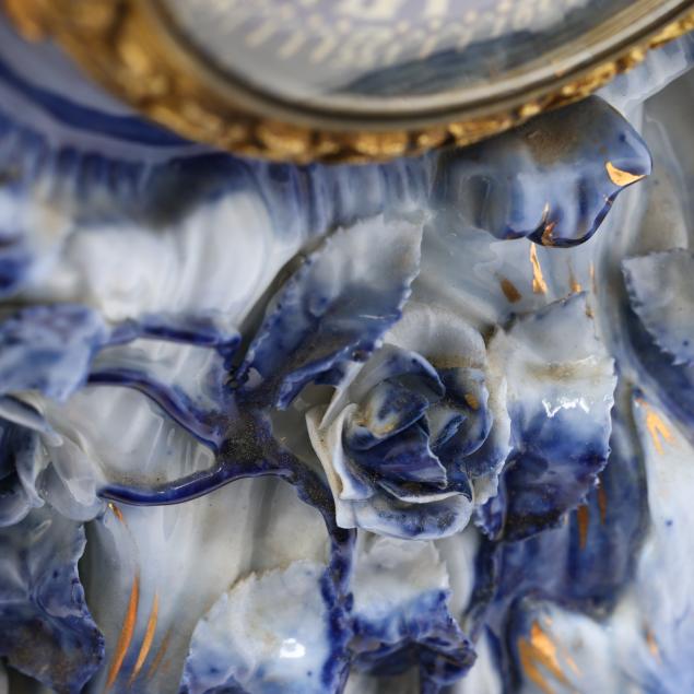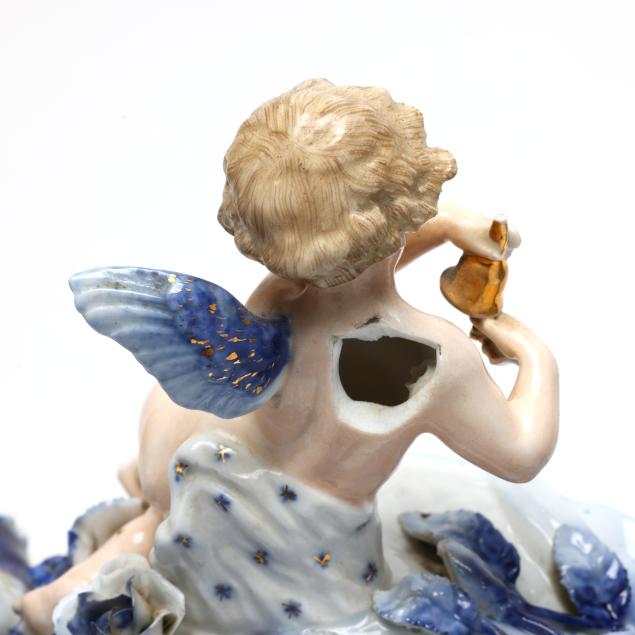 All with scattered fleabites and small chips to flowers; cupid with loss to one wing and small loss to hand, male figure with loss to one figure; lacking pendulum.