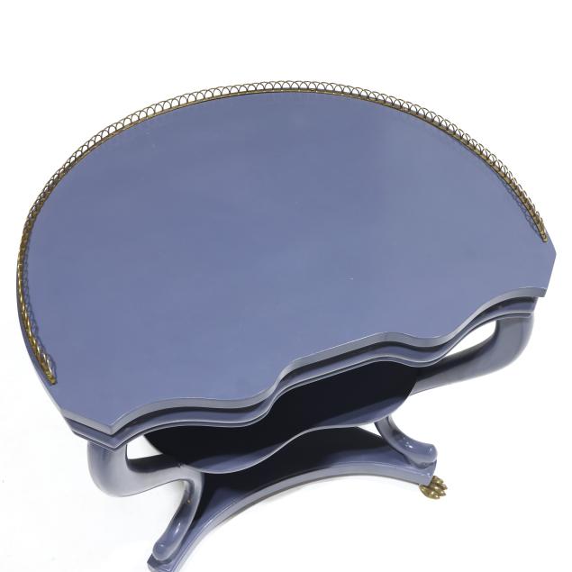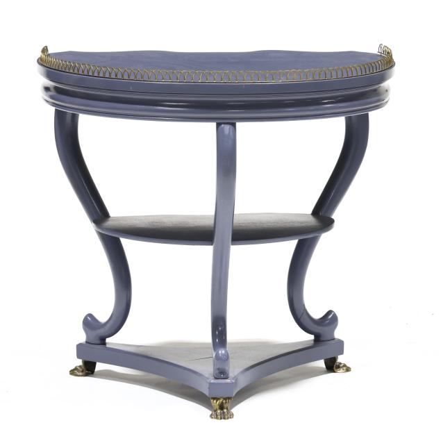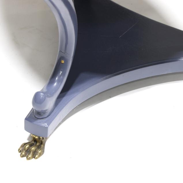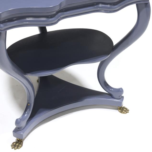 Mid- to late 20th century, later Colonial blue paint with brass gallery edge, serpentine molded front edge, S-scrolled legs with conforming lower shelves on cast brass paw feet.