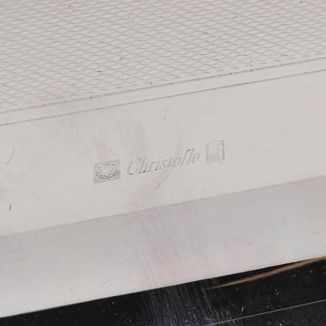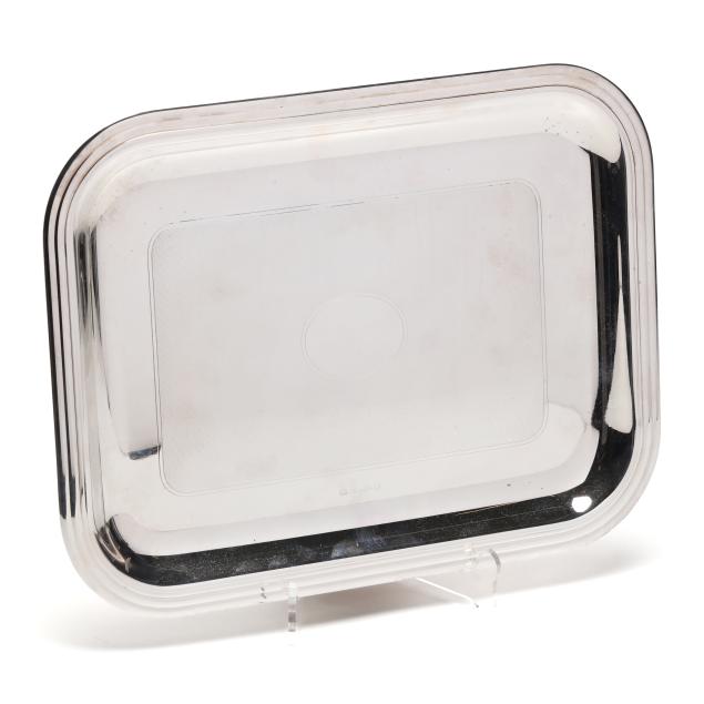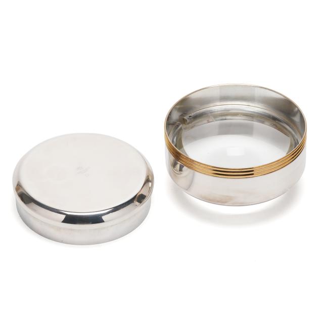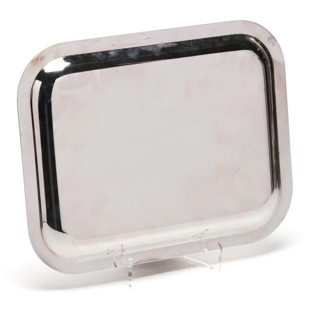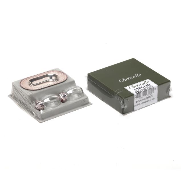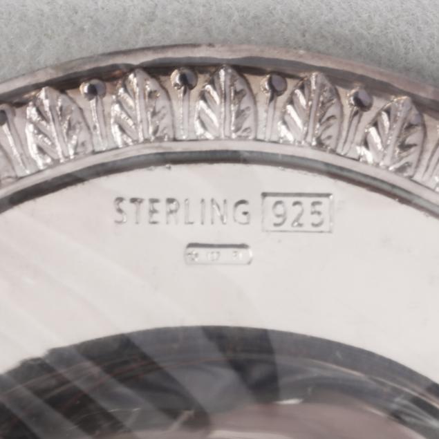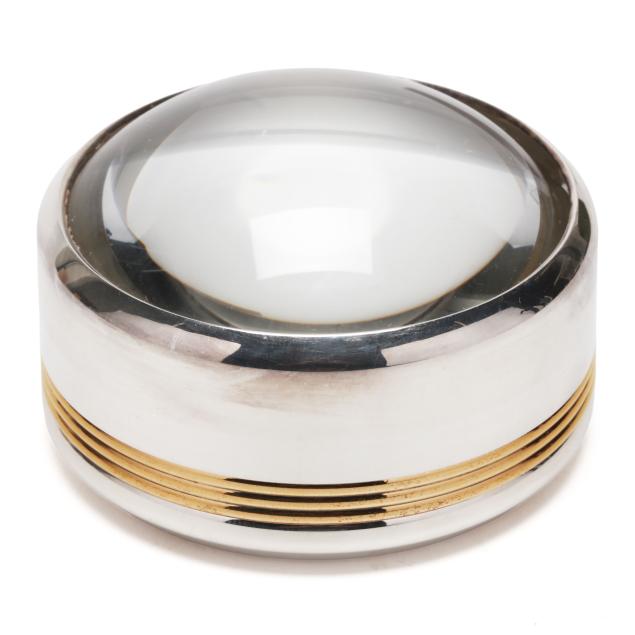 Late 20th century marks, includes set of (4) salt and pepper shakers each with sterling lids and a sterling oval tray, Italian 925 silver hallmarks; a desk loop formed as a domed crystal with silver-plated and gilt bezel; and a silver-plated tray; all with original retail boxes.
