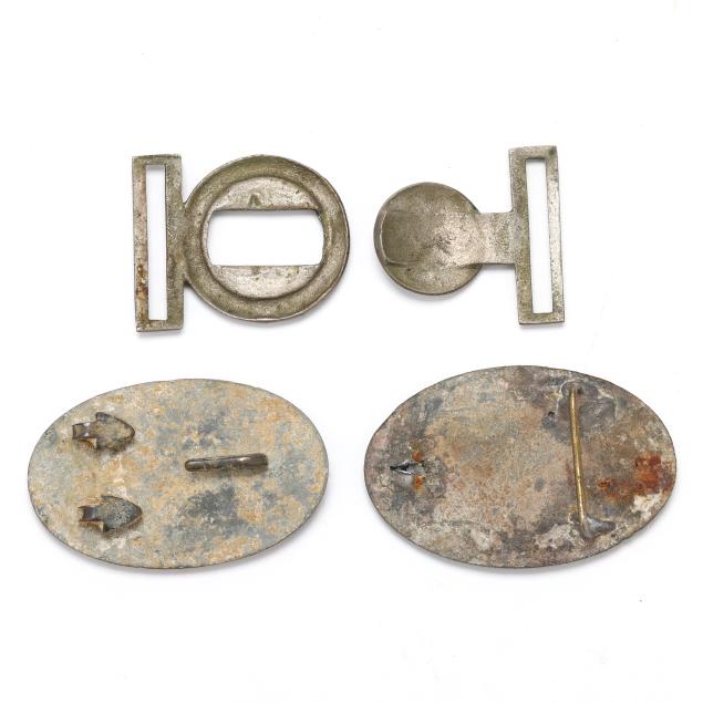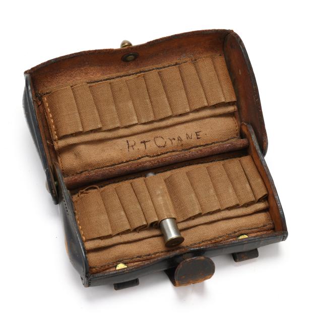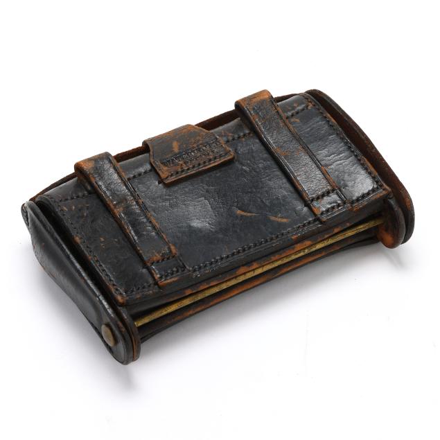 To include: U.S. Civil War belt plate with standard hooks and tongue configuration on the reverse (3-3/8 x 2-1/4 in.) (nice patina); a late 19th century leather cartridge box (4-3/4 x 6-1/2 in.) fitted with a small New Jersey oval plate, the interior contains a round of ammunition and is personalized