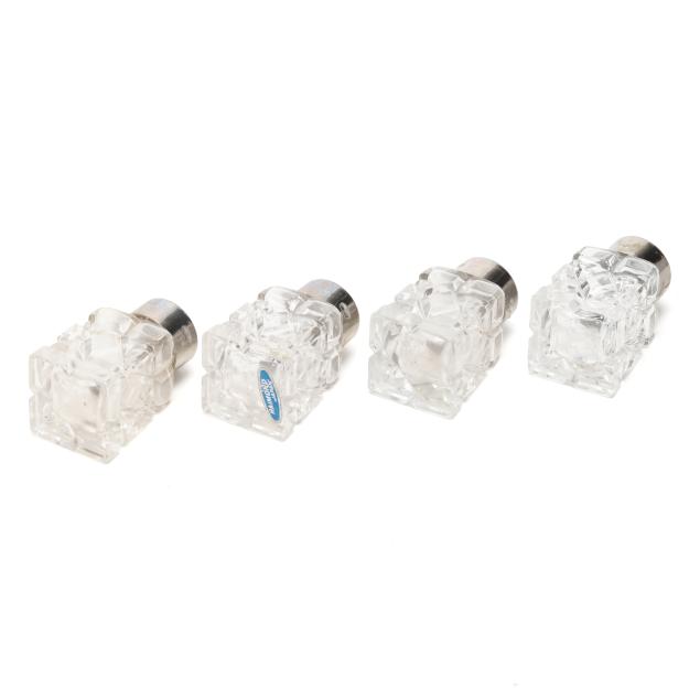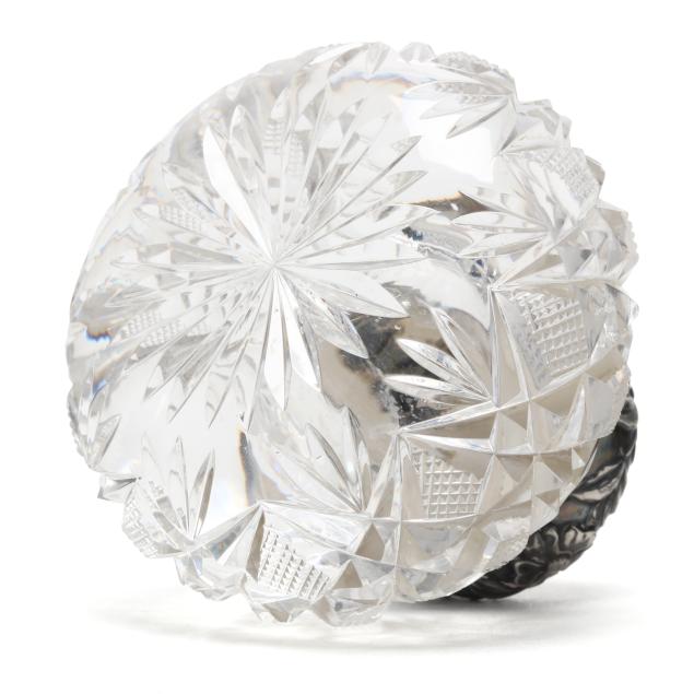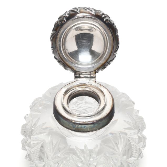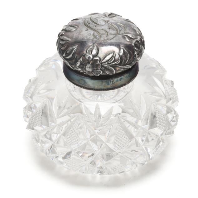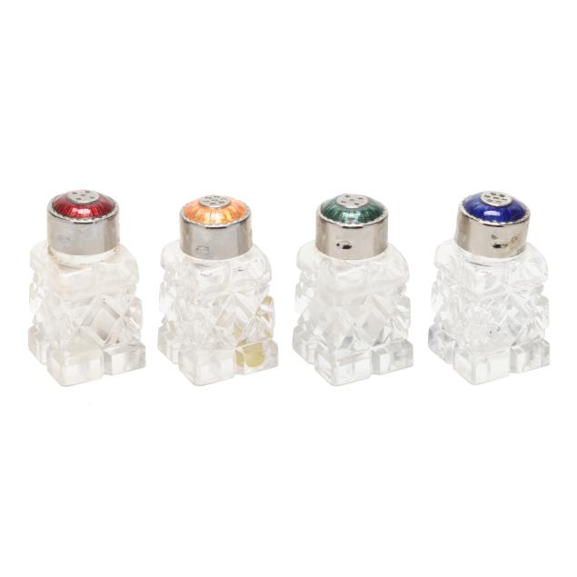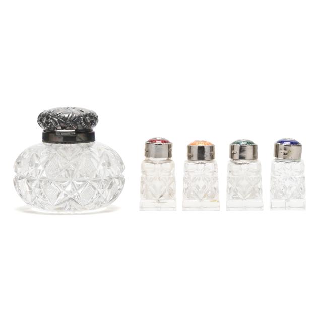 Includes a dresser bottle, cut crystal with silver-plated repousse lid, monogrammed, not marked (3 1/4 x 4 in. dia.); and (4) salt and pepper pressed glass shakers with multicolored enamel silver-plated lids (each 2 1/4 x 1 1/4 x 1 1/4 in.)