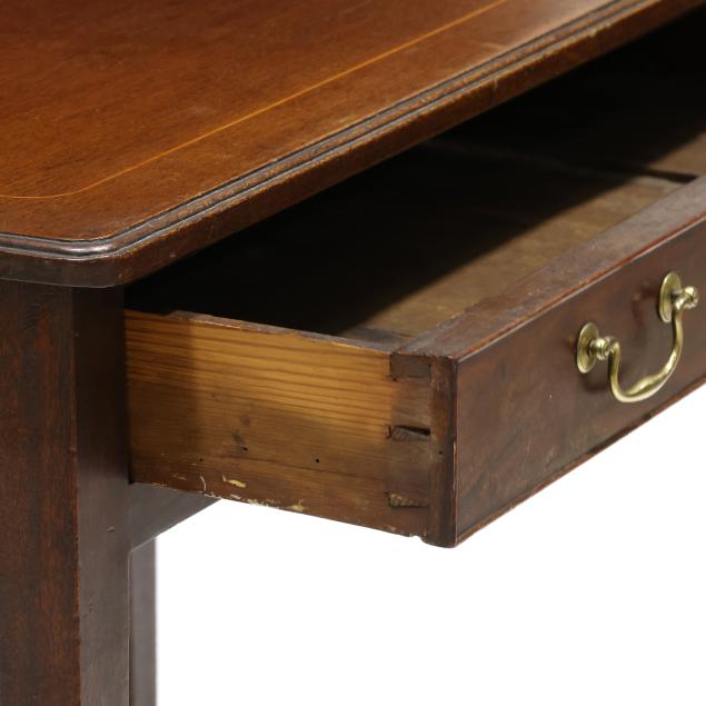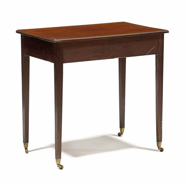 Late 18th century, pine secondary, top with molded edge, banded line inlay, front rounded corners, single cock beaded drawer, flush skirt, straight tapered legs on casters.