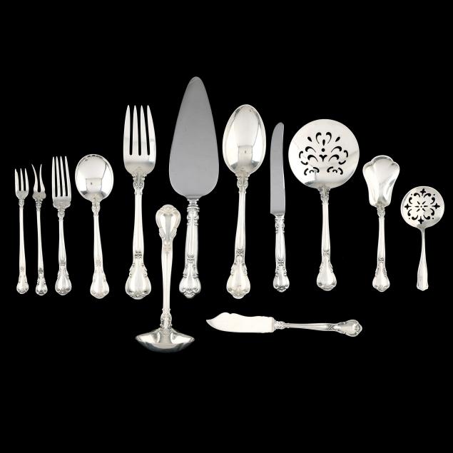 (104) pieces to include: (12) dinner knives (8 7/8 in.); (12) dinner forks (7 in.); (12) salad forks (6 1/2 in.); (22) teaspoons (5 3/4 in.); (12) round bowl soup spoons; (12) flat handle butter spreaders; (6) seafood forks; (6) tablespoons; a pie server; a cold meat fork; a gravy ladle; a sugar spoon; a tomato server; a bon bon spoon; a master butter spreader; a lemon fork; and a youth fork and knife; not monogrammed, presented in a fitted case.