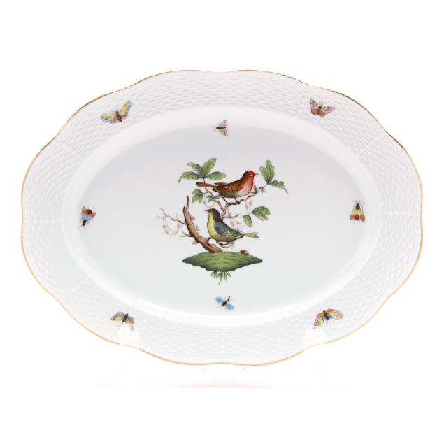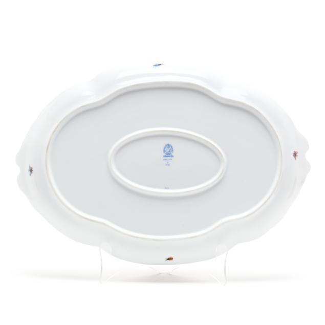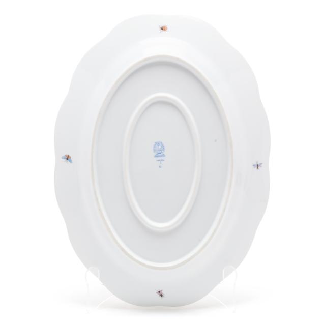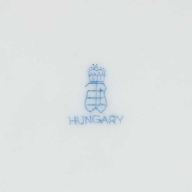 Hungary, hand-painted and gilt porcelain, including a #1173 handled chop plate, with 1915-1930 mark to underside (15 3/4 x 13 7/8 x 3 in.); a #400 oval ribbon tray (15 3/4 x 11 1/8 x 1 5/8 in.); and a #103 oval serving platter (13 1/2 x 9 7/8 x 1 1/4), all with company backstamps to underside.