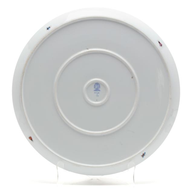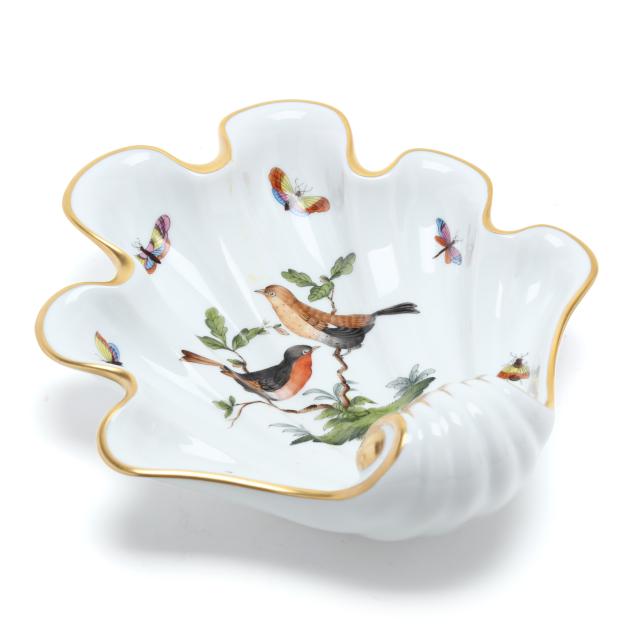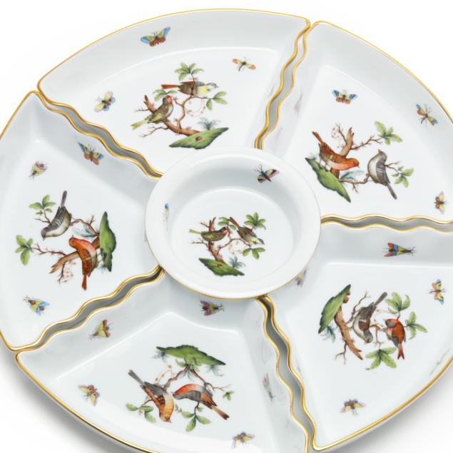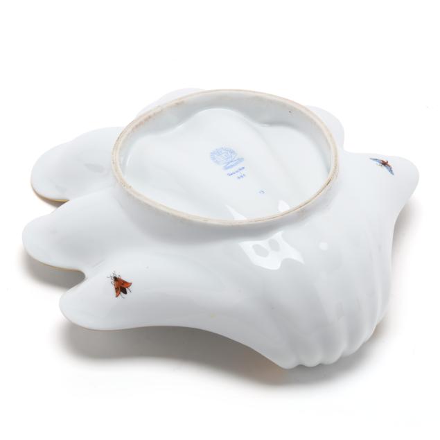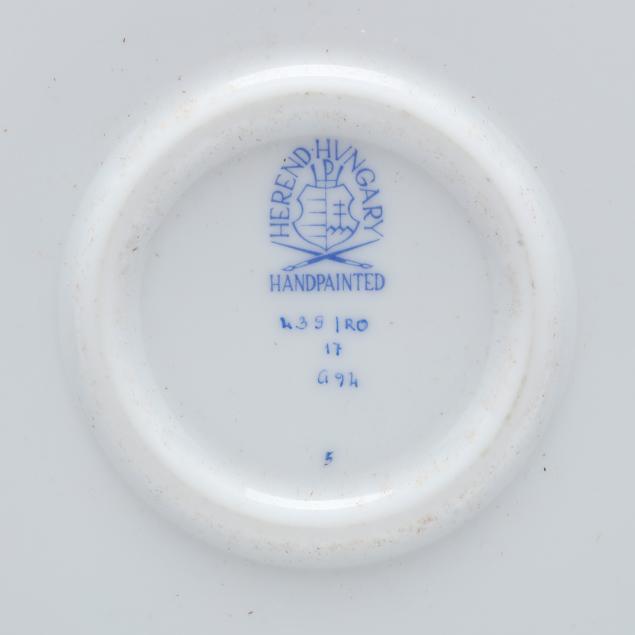 Hungary, hand-painted and gilt porcelain, including a (7) piece set: a #439 tray (14 1/2 in. diameter), (6) #444 individual side sections (8 1/4 x 5 3/8 x 1 1/2 in.), and a #445 center bowl (4 3/4 diameter x 1 1/2 in.); and a #691 shell shaped dish (9 x 8 5/8 x 3 1/4 in.), all marked with company backstamps to underside.