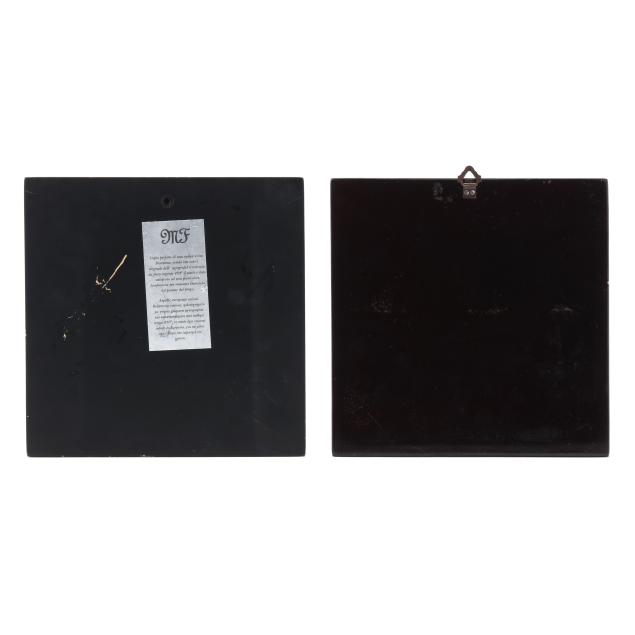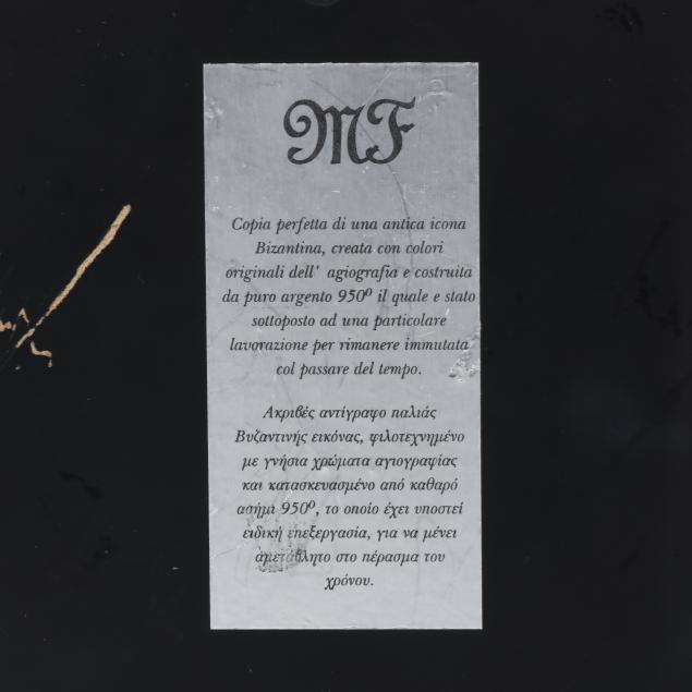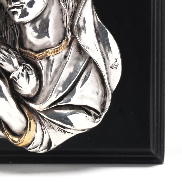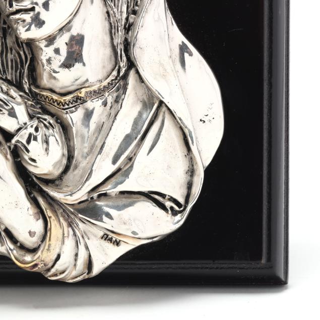 .950 silver, late 20th century, both after a Byzantine icon of the Madonna and Christ child, one plaque labeled to verso, one with matte ebonized wood frame and the other with glossy ebonized wood frame, both impressed with silver grade and "ΠAN" to silver.