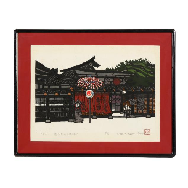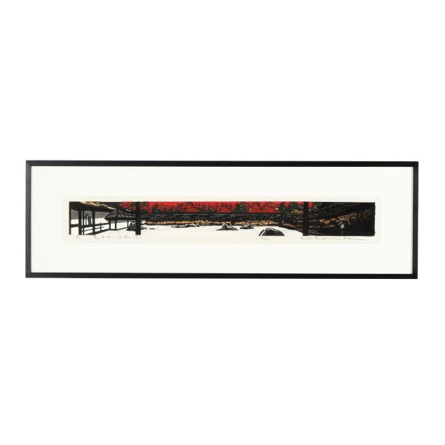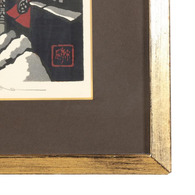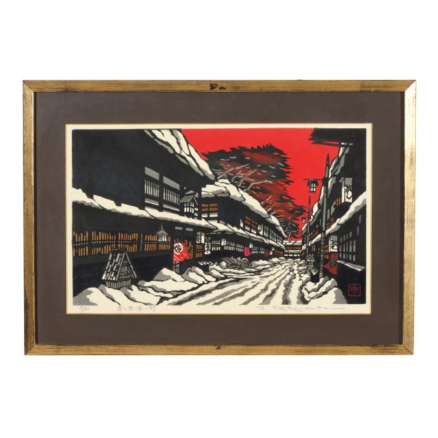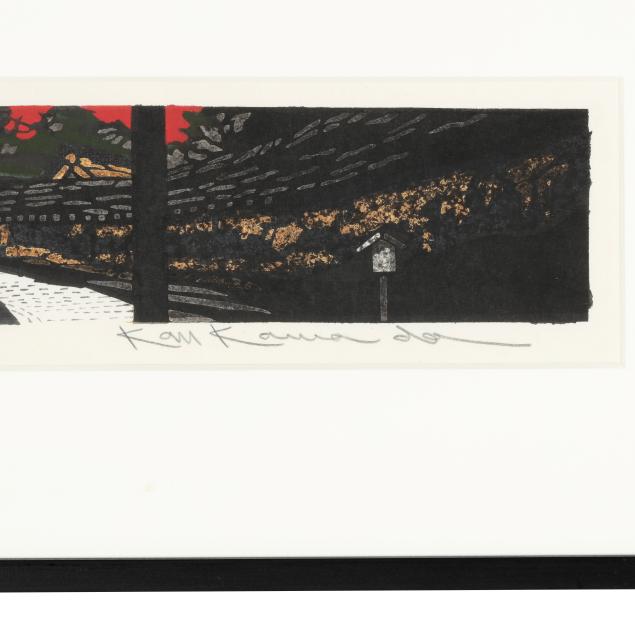 Deeply influenced by the aesthetics of shin-hanga yet working firmly within the modern era, Kawada became especially celebrated for his poetic depictions of Kyoto machiya townhouses, temple precincts, snow-covered farmhouses, and quiet rural vistas. His compositions frequently exclude figures, allowing architecture, shifting light, and seasonal atmosphere to convey a meditative stillness. Masterful bokashi shading and carefully balanced color harmonies lend his prints a luminous, almost nostalgic quality.