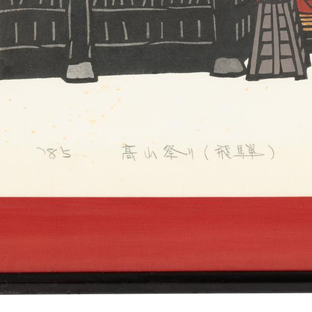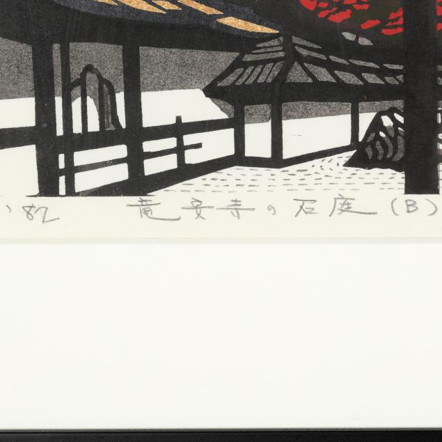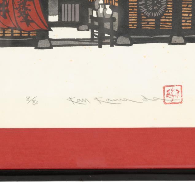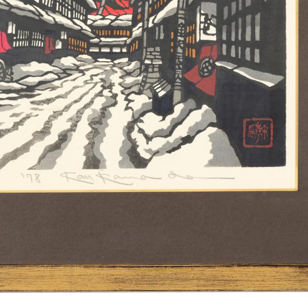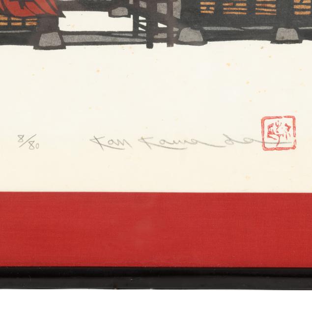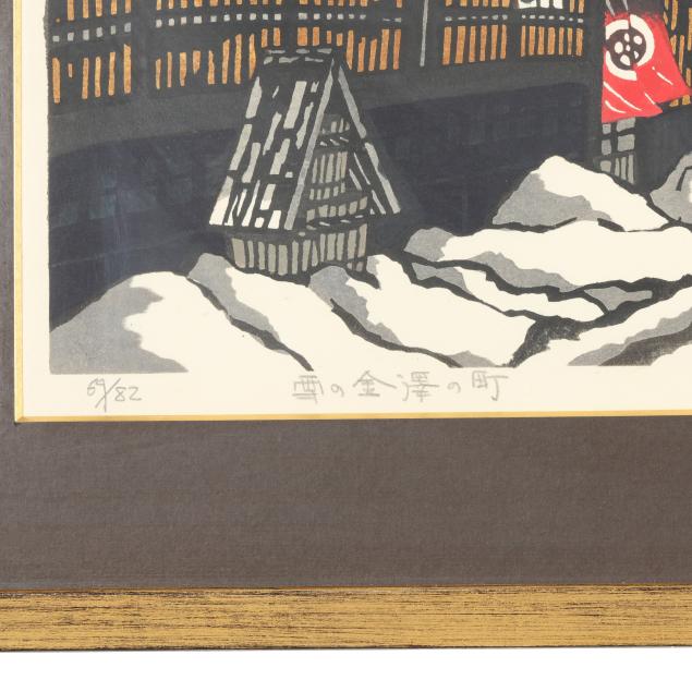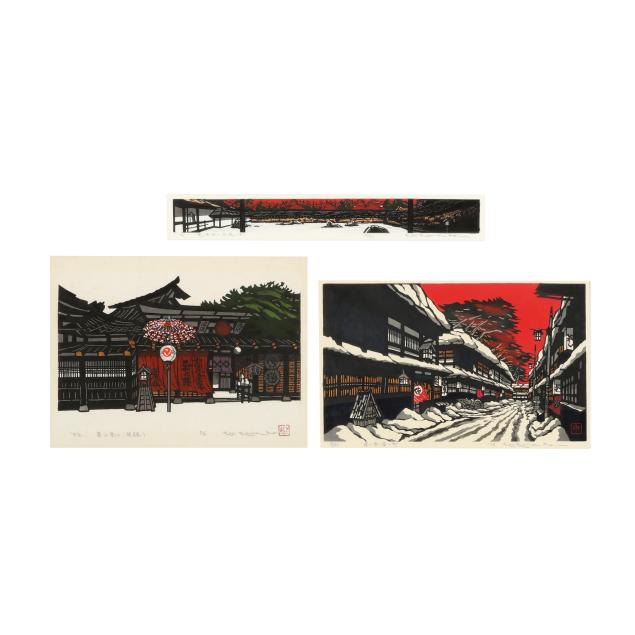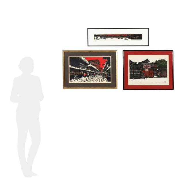 Includes three woodblock prints, the first, entitled Snowy Kanazawa Town, with red artist seal to lower right corner, pencil signed to lower margin 69/82, title in Japanese, '78, Kan Kawada, framed in Japan by Kato with gold edge black mat under glass in giltwood frame (Frame dimensions 22 x 31 x 1 in., Sight size 14 3/4 x 23 1/2 in.)(Very good condition; not examined outside of the frame), the second, entitled Takayama Festival, pencil signed to lower margin '85, title in Japanese, 8/80, Kan Kawada, with red artist seal, presented under glass with red mat in black wood frame with rounded corners (Frame dimensions 22 1/2 x 28 1/4 x 1 in., Sight size 21 x 27 in.)(Scattered foxing throughout; not examined outside of the frame), and the third, entitled Rock Garden at Ryoanji, pencil signed to lower margin '82, title in Japanese, 64/200, Kan Kawada, framed in Japan by Kato under glass with white mat in black wood frame (Frame dimensions 10 1/2 x 34 x 1 in., Sight size 4 x 27 1/2 in.)(Very good condition; not examined outside of the frame).