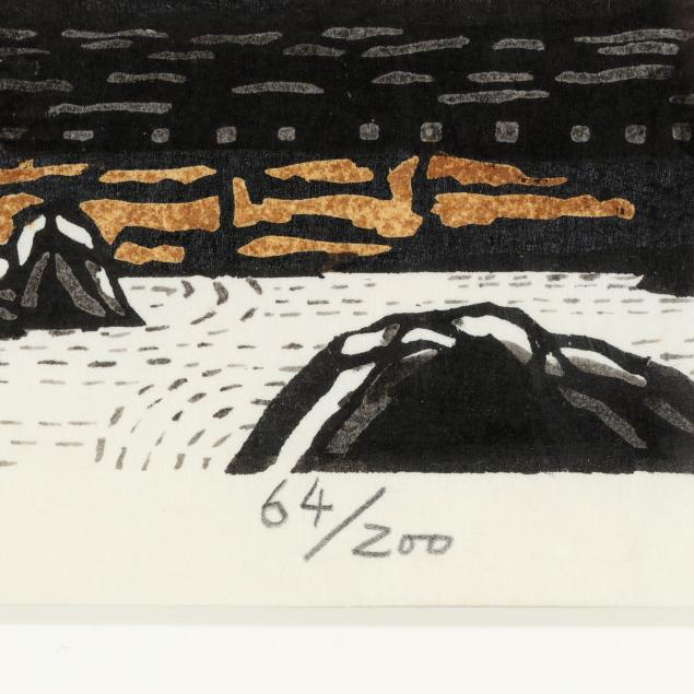 Kan Kawada was a leading figure in the postwar revival of Japanese woodblock printmaking, widely admired for his technically refined and emotionally resonant landscapes. Born in Hokkaido, Kawada trained in the traditional ukiyo-e method of collaborative print production, working closely with skilled block carvers and printers to achieve subtle tonal gradations and richly textured surfaces.