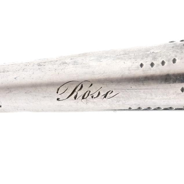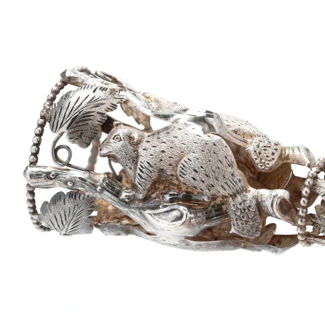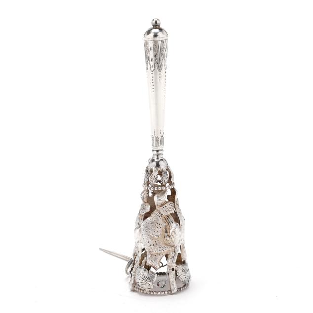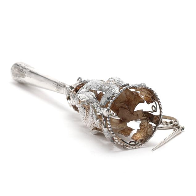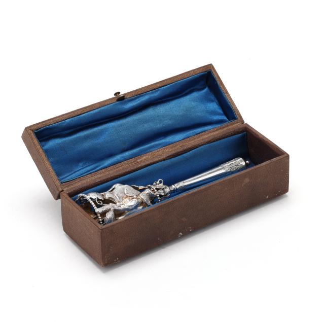Circa 1870, likely Continental, unmarked, the bouquet holder featuring a charming design of a squirrel clambering up a branch, the hollow handle is engraved "Rose," retaining original finger ring and bouquet pin attached to the body with a chains. Presented in the original satin lined case.