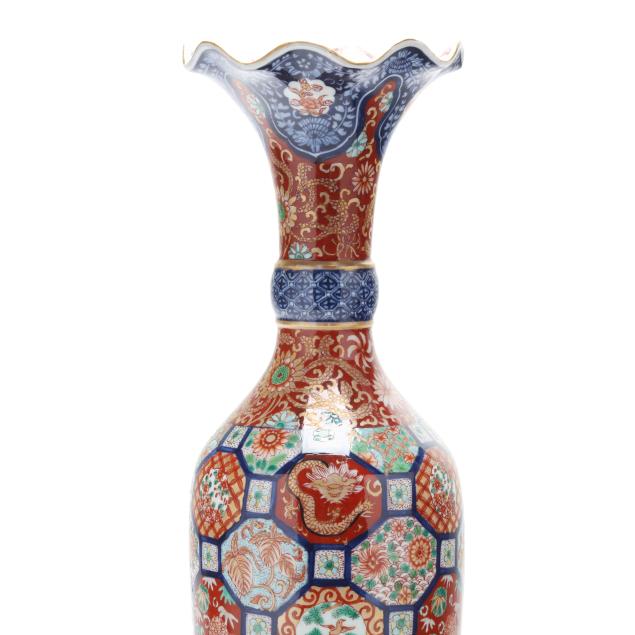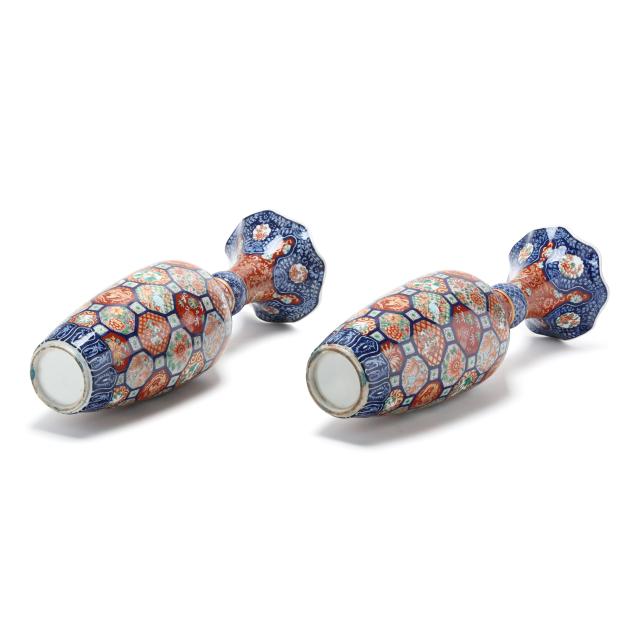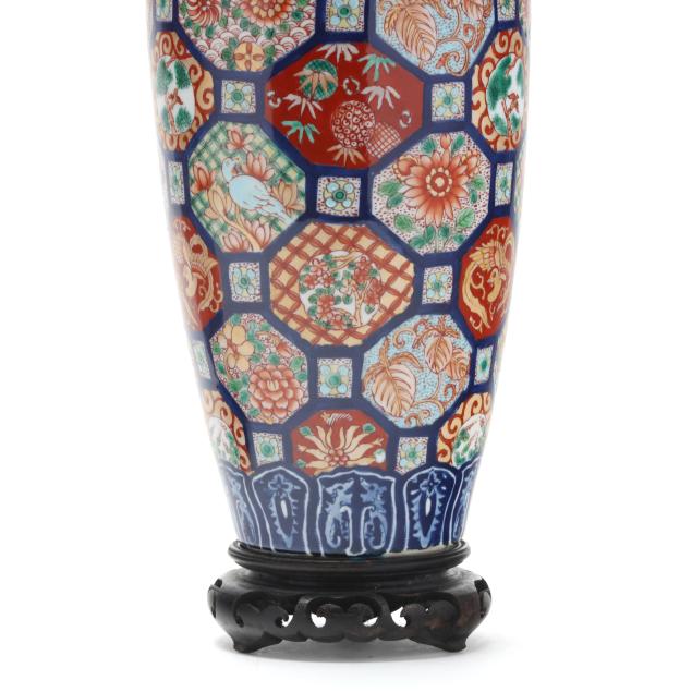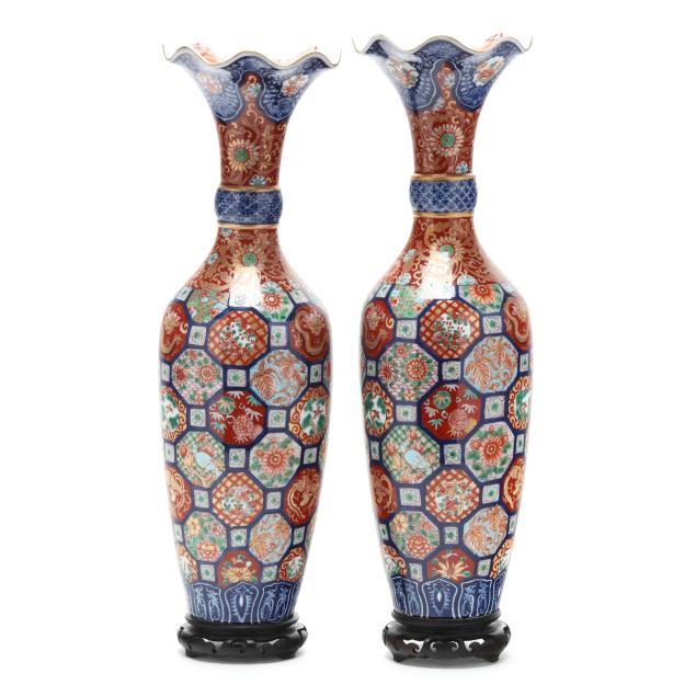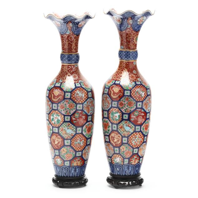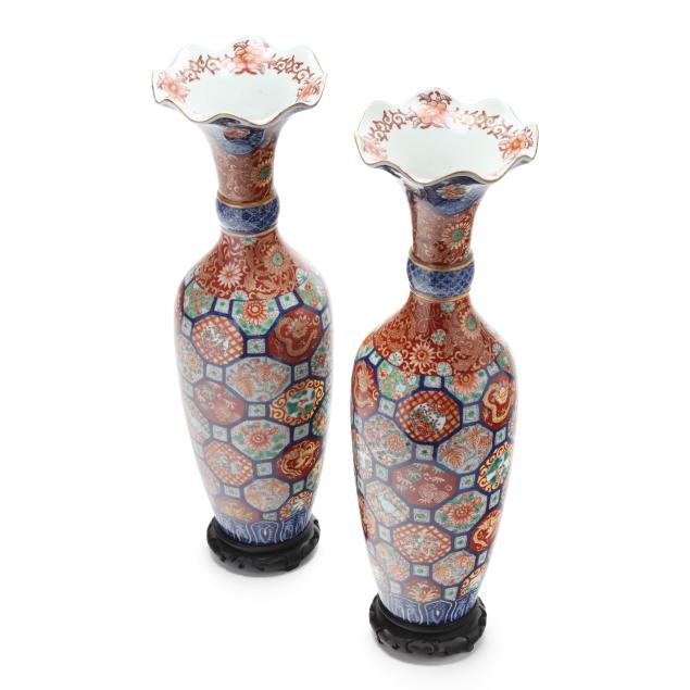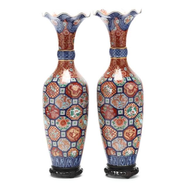Meiji period (1868-1912), hand-painted and gilt tapered vases with flared and fluted rim and banded neck, each with patchwork decoration to body featuring flora, fauna, dragons, and textile designs, unmarked, presented together with carved wood stands.