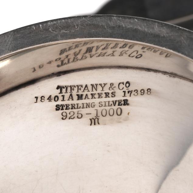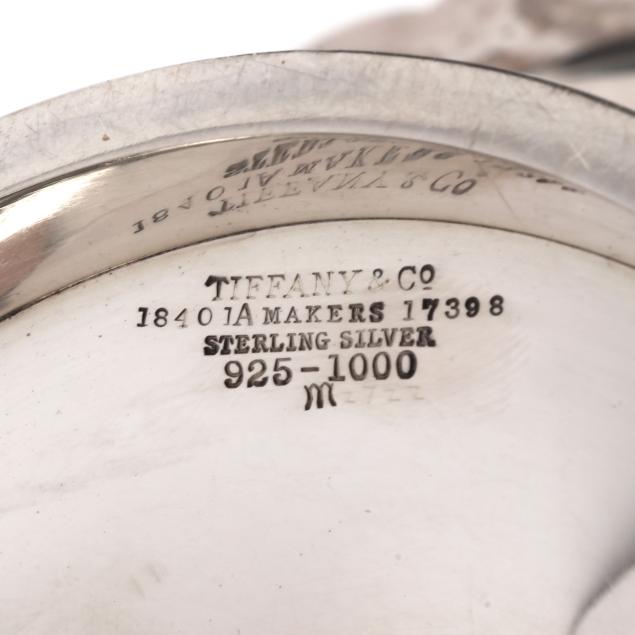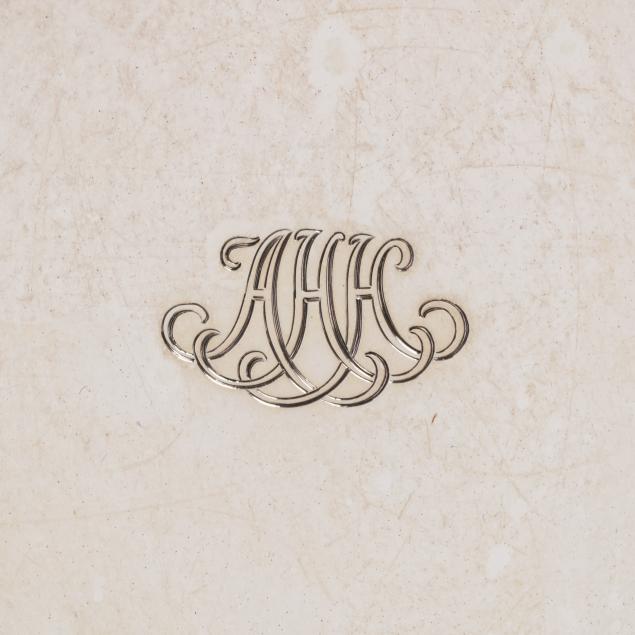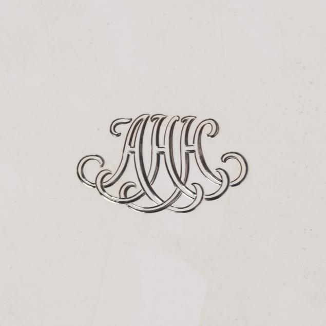Period marks circa 1907-1947, directorship of John C. Moore II, pattern number 18491A, each featuring a shaped rim with shell and bead course motifs, over a foot with a twisted rope motif, uniform "AHH" monogram to the centers.