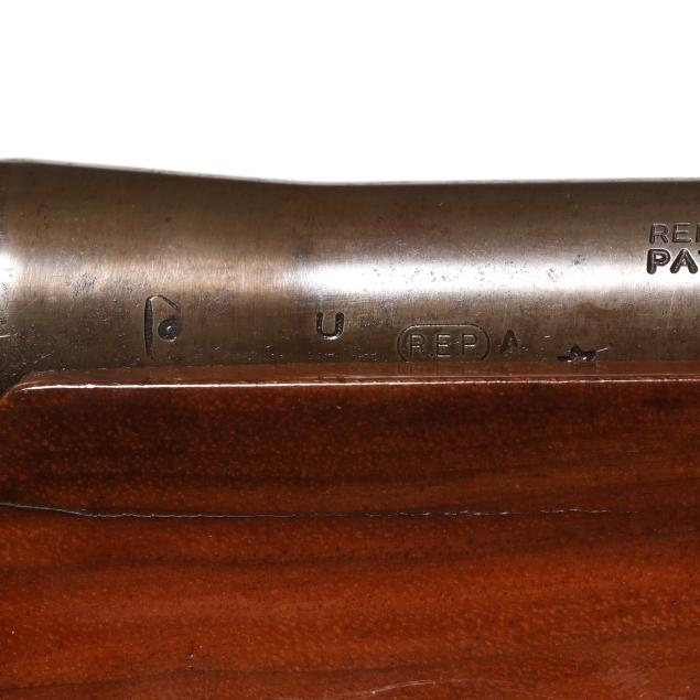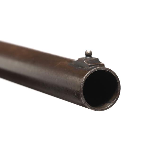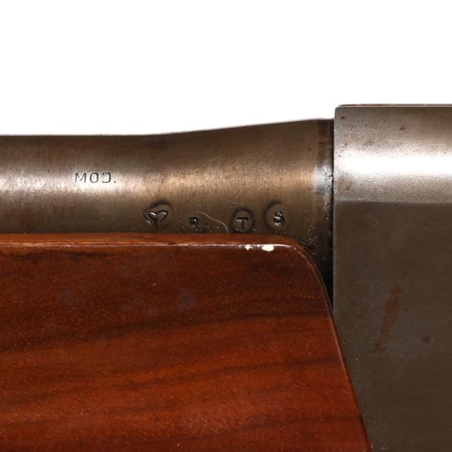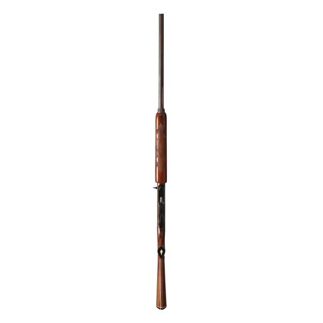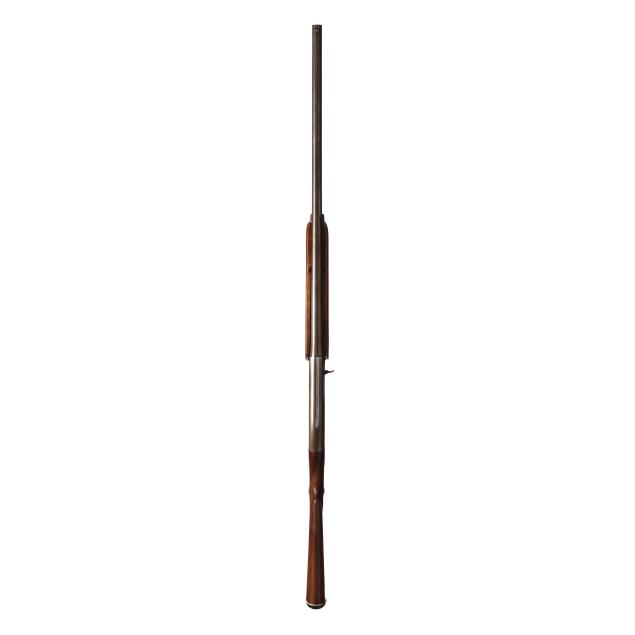 Overall fair estate condition, blued surfaces are a brownish patina possible derived from a cold blue process, scattered surface and light pitting throughout, anodizing worn from edges of trigger guard, forend cap shows surfaces rust in grooves, wad fouling in bore, buttstock and forend finishes are healthy with slight field marks, checkering on both remains crisp and clean.