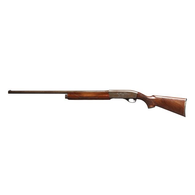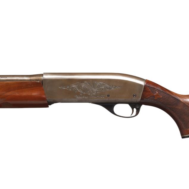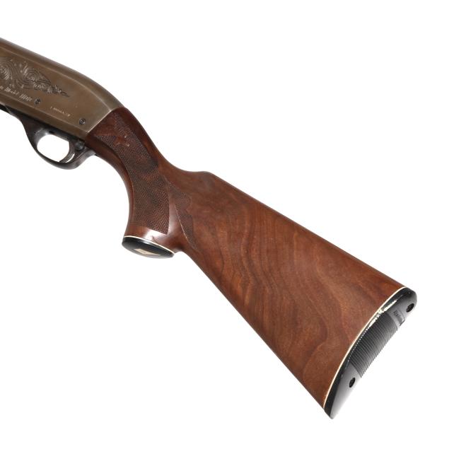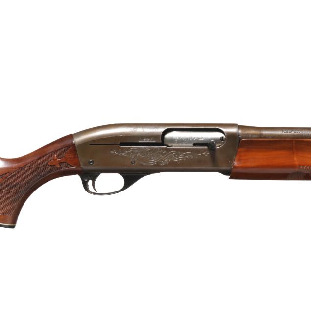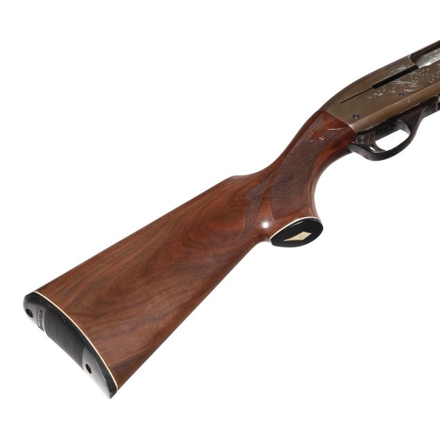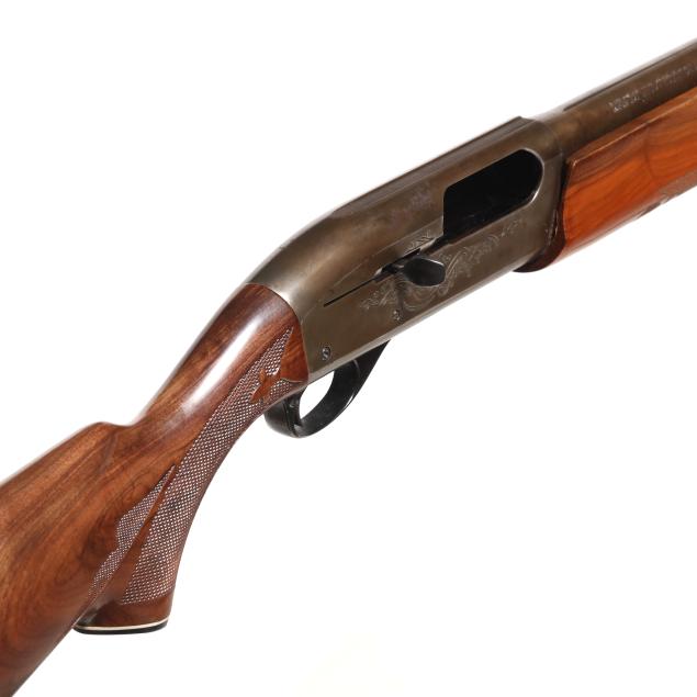 Serial number L400633V present along side of engraved semi-automatic action receiver, texxt of REMINGTON MODEL 1100 present on left side of receiver, text of 12GA FOR 2 3/4 OR SHORTER SHELLS present on 28 in. steel barrel with soldered front sight base and single bead, manual safety, anodized aluminum trigger guard, ornately checkered lined capped walnut pistol grip buttstock with lined factory buttplate, ornately checkered walnut forend.