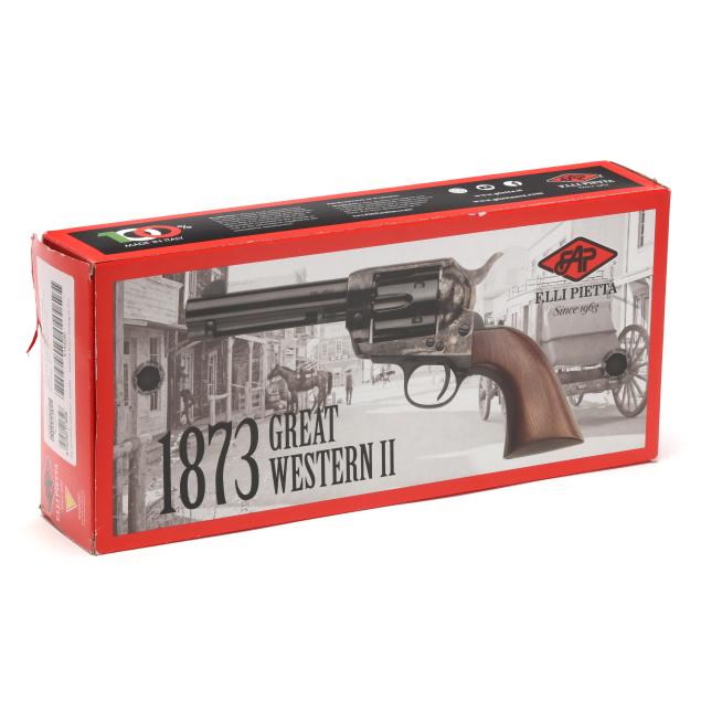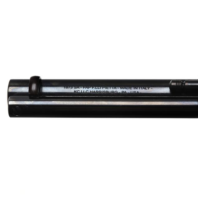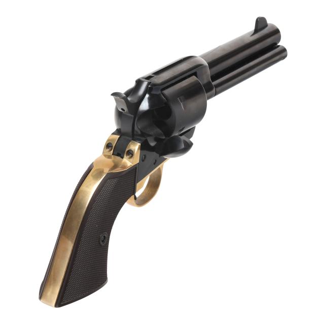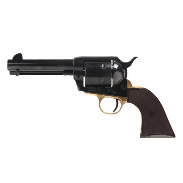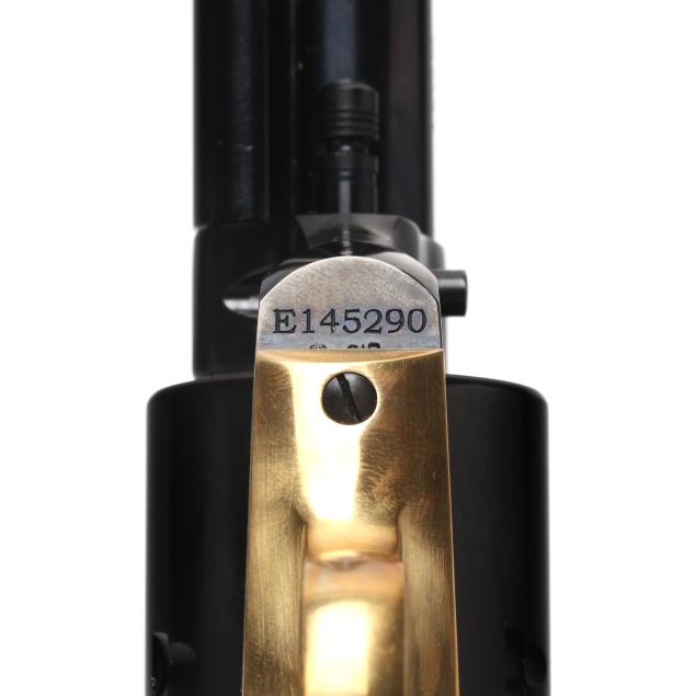 Serial number E145290 present on underside of blued frame, text of 45 COLT present along left side of 5 in. blued barrel with front blade sight, brass trigger guard and back strap, plastic grip scales, additional cylinder in .45ACP calber.