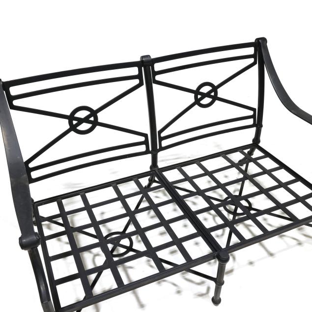 Late 20th century, black painted aluminum, cross form back, lattice seat, straight legs with stretcher base, labeled, with cushions.
