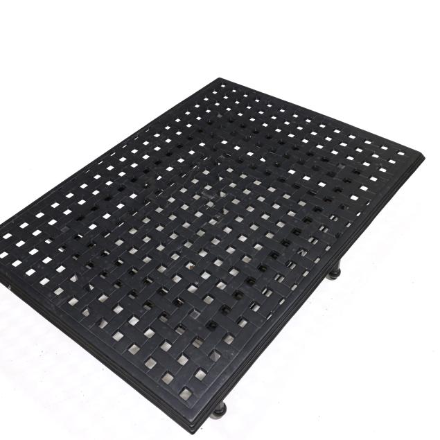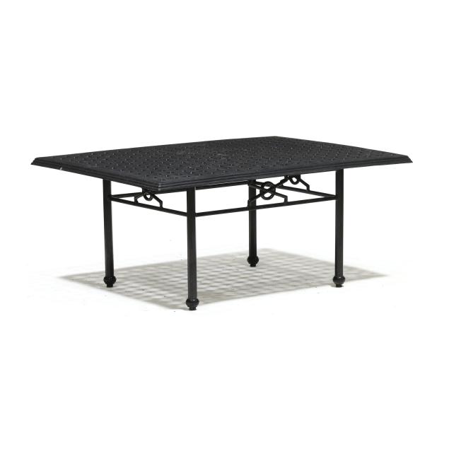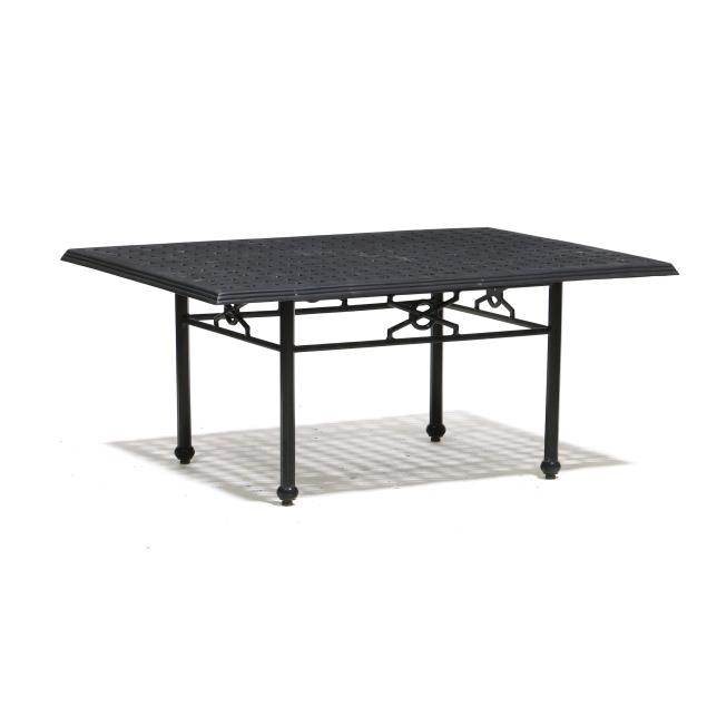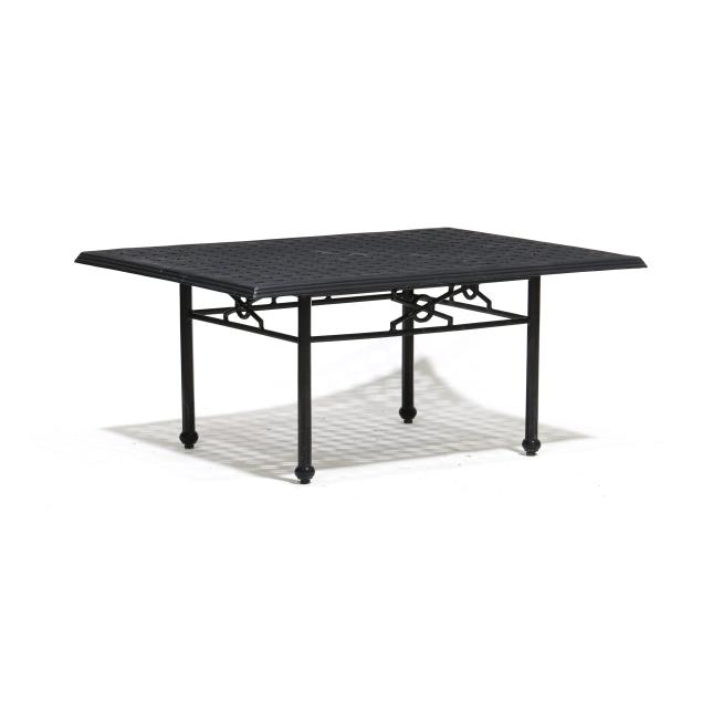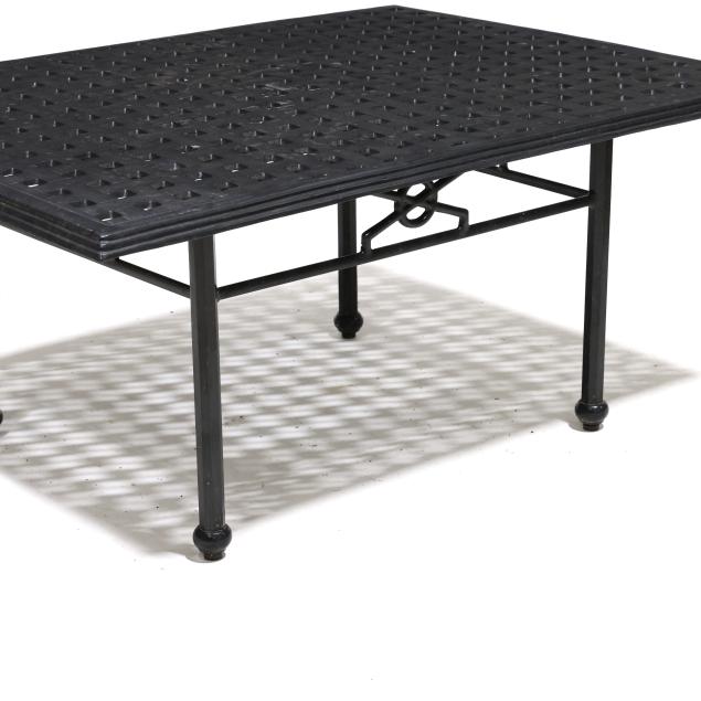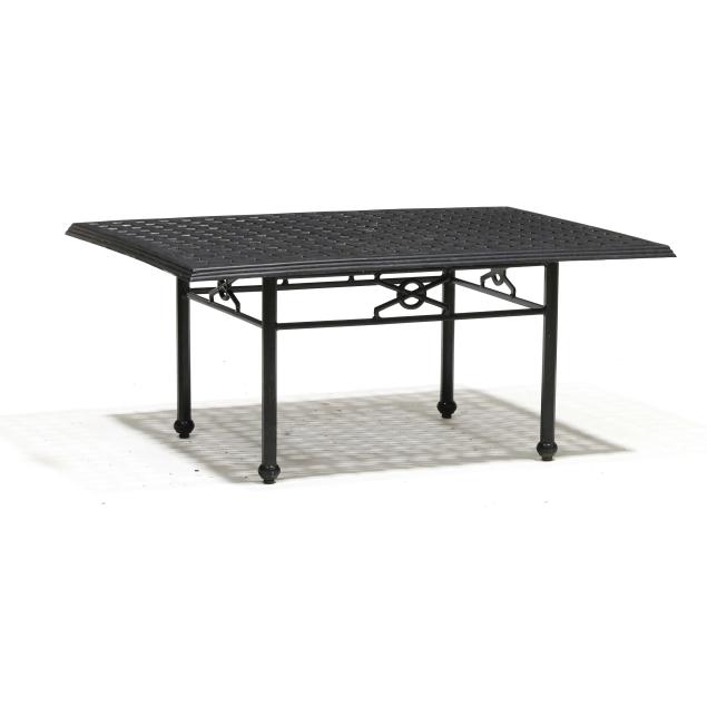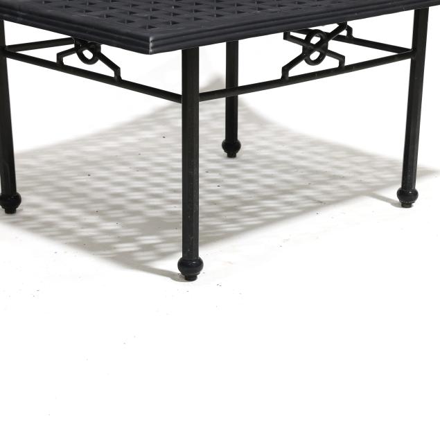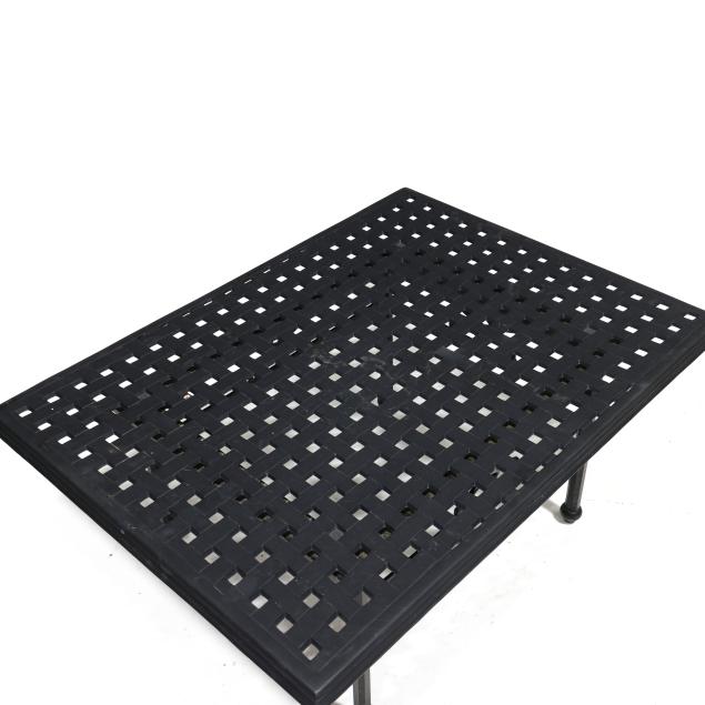 Late 20th century, black painted aluminum, one part form, basketweave style rectangular top on straight faceted legs with stretcher base, appears unmarked.