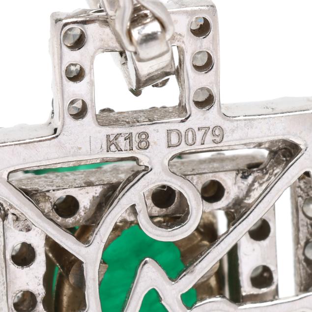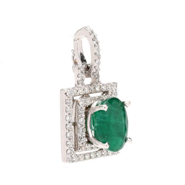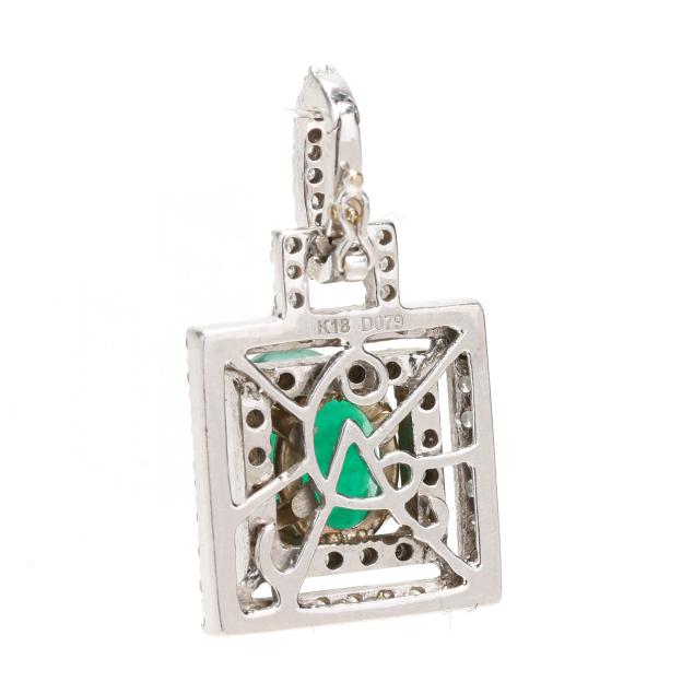 Rectangular pendant centered on a prong set oval cut emerald (11.0 x 8.5mm), set atop a rectangular frame set with full cut round diamond melee weighing .79 total carat, completed with a hinged bail with figure eight safety, marked 18K D079.
