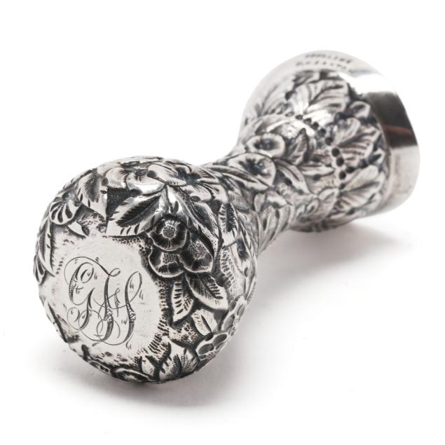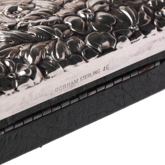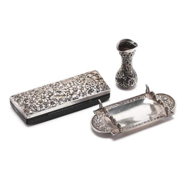 The first an eyeglass holder by Gorham, model number 46, first half of the 20th century (1 1/4 x 6 1/4 x 2 3/4 in.) (interior of case with loose fabric lining, wear to leather on exterior of case); the second a pen tray by Gorham, late 19th century, model number 40 (6 x 2 3/4 in.) (good estate condition); and the third a handle retailed by W. H. Saxton, lacking a manufacturer's mark, period monogram "GH," late 19th century (3 1/4 in.) (good estate condition).