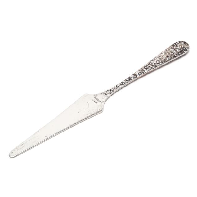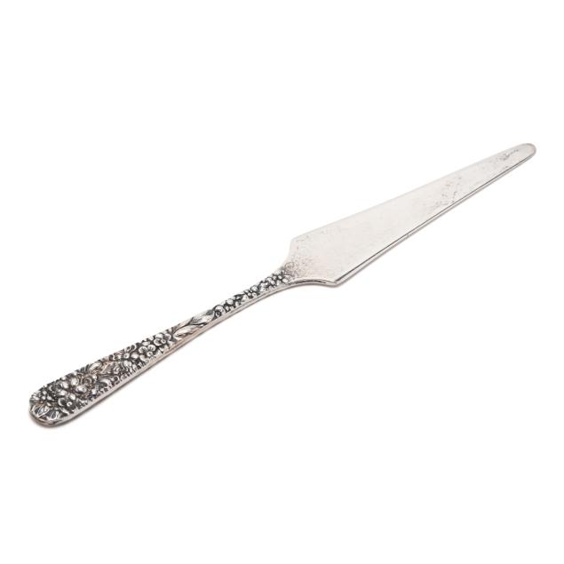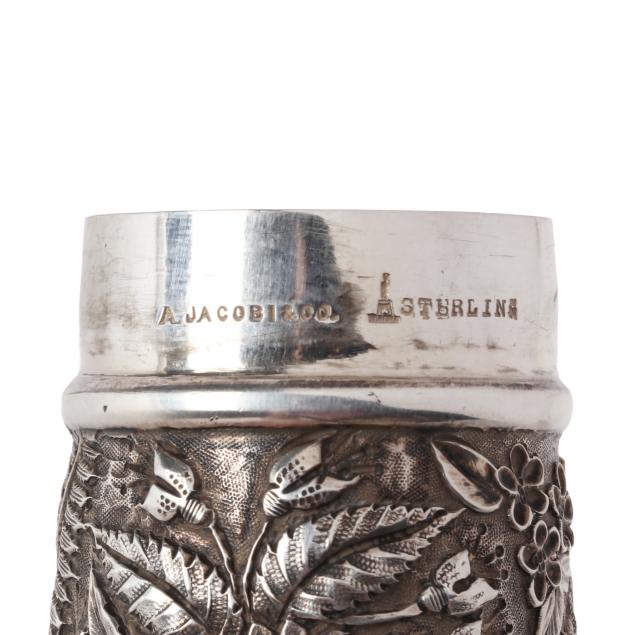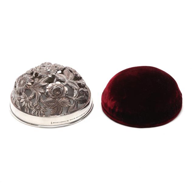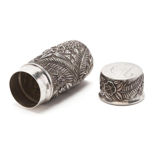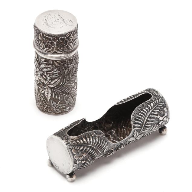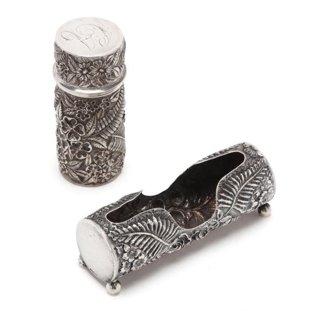 Including a pin cushion by Jenkins & Jenkins, model number 55, circa 1908-1915, with original burgundy velvet covered liner, no monogram (4 1/2 in. diameter); a toothpick holder by Baltimore Silversmiths Mfg. Co., early 20th century (4 in. long); a cylindrical case by A. Jacobi & Jenkins, circa 1900, period script monogram "CA" to cap; and a vintage letter opener by Stieff (6 7/8 in.).