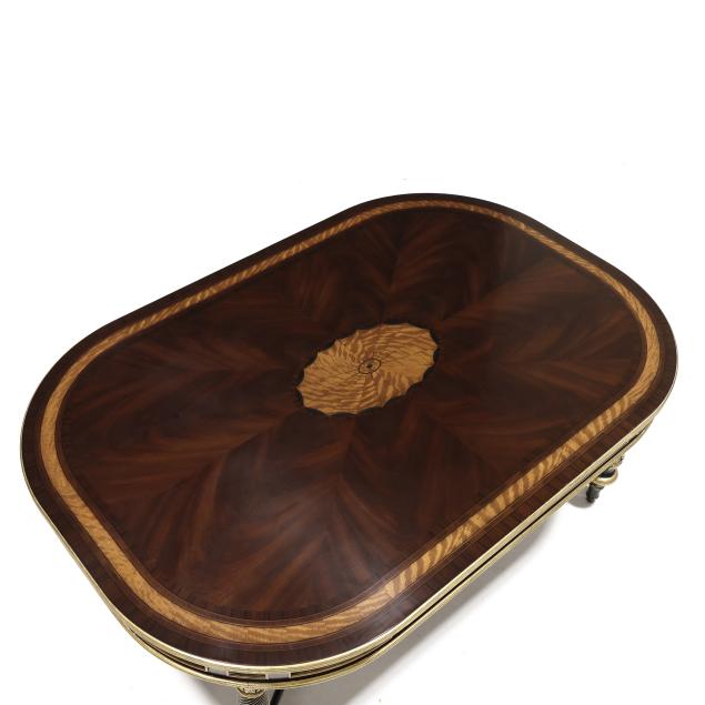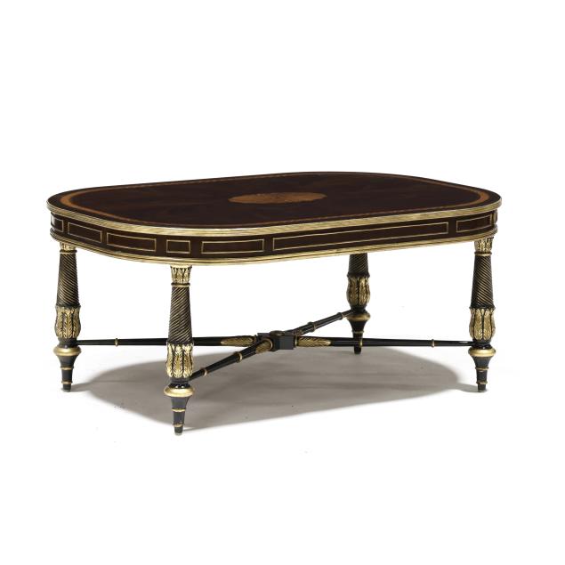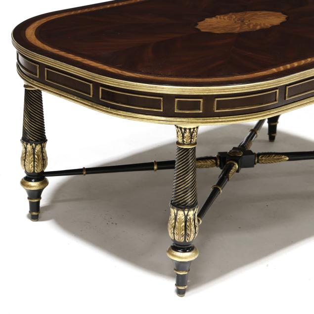 Contemporary, high grade mahogany and mahogany veneers, rectangular top with banded inlay and central paterae, reeded gilt edge, spiral twist and acanthus carved legs, stretcher base, labeled.