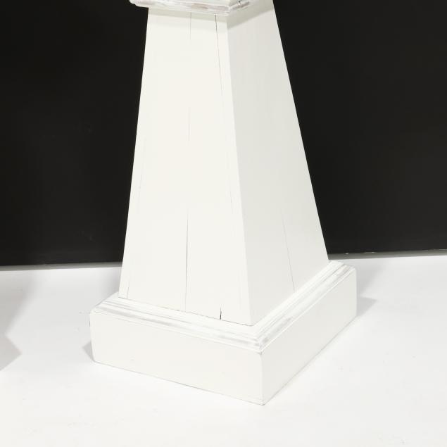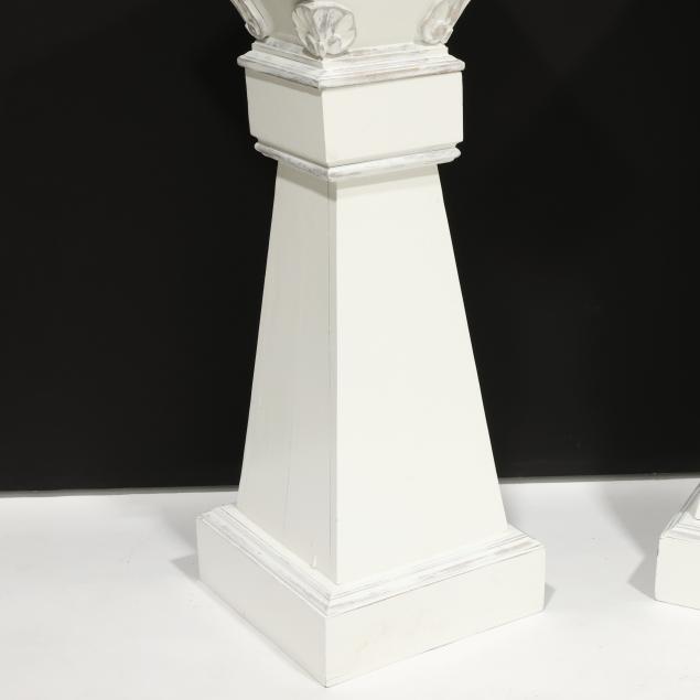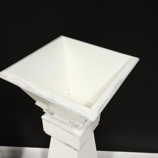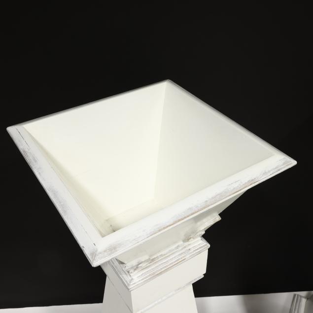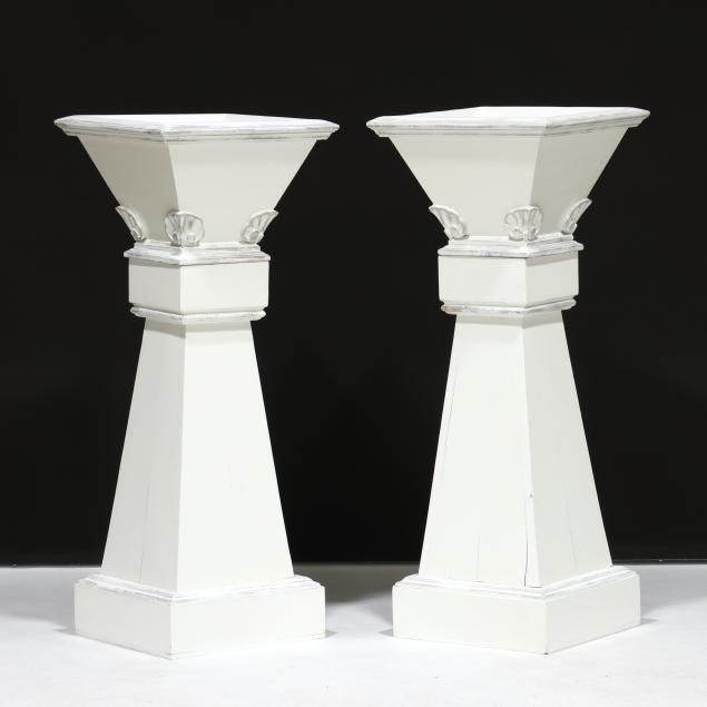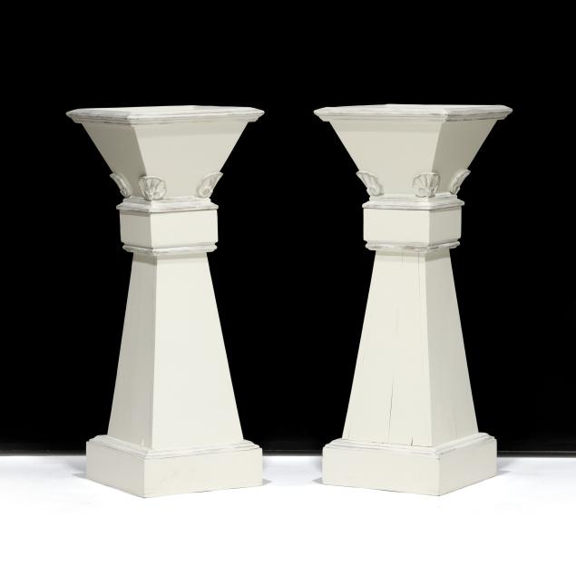Two part form, white high gloss paint with distressed surface, relief carved shells to the lower corners of the jardinieres, tapered pedestals with flush molded base.