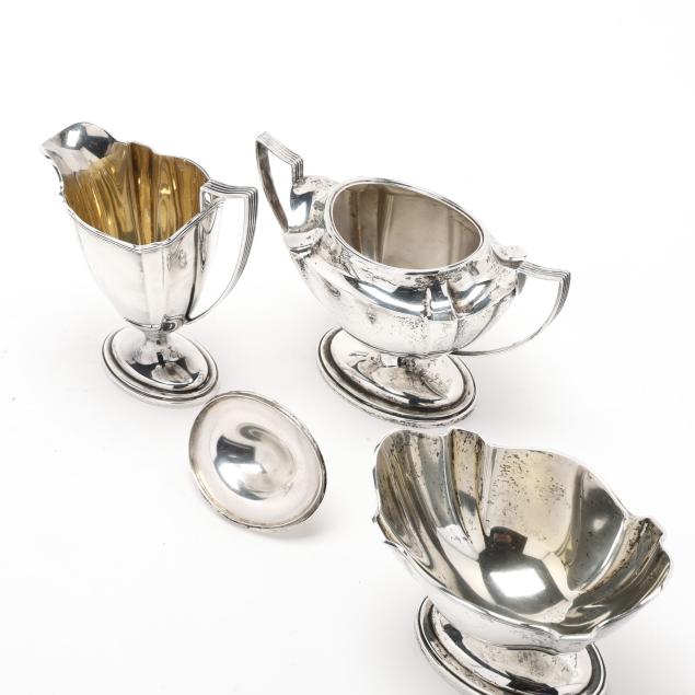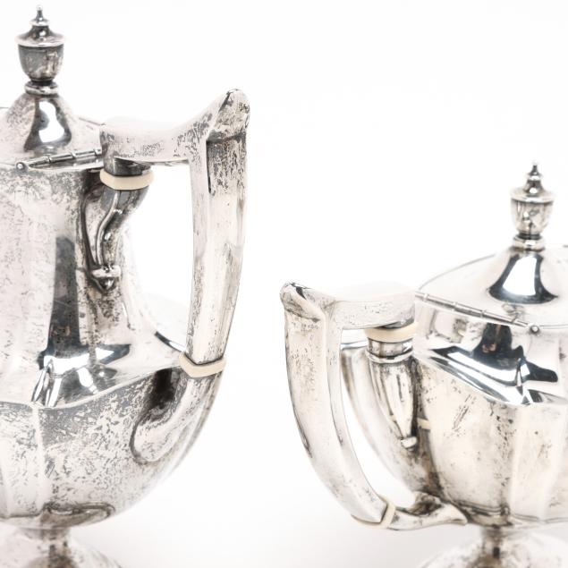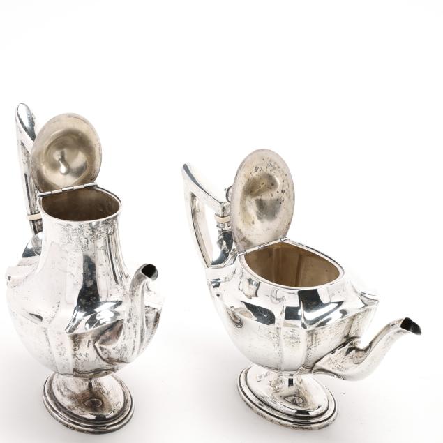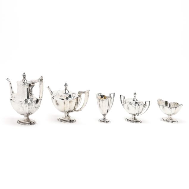 Pattern number 2441, 2442, 2413, 2415, and 2414; includes a coffee pot (9 1/2 in.); teapot (7 in.); creamer; lidded sugar bowl; and waste bowl; not monogrammed.