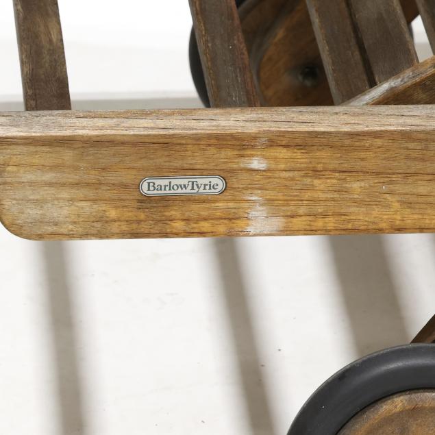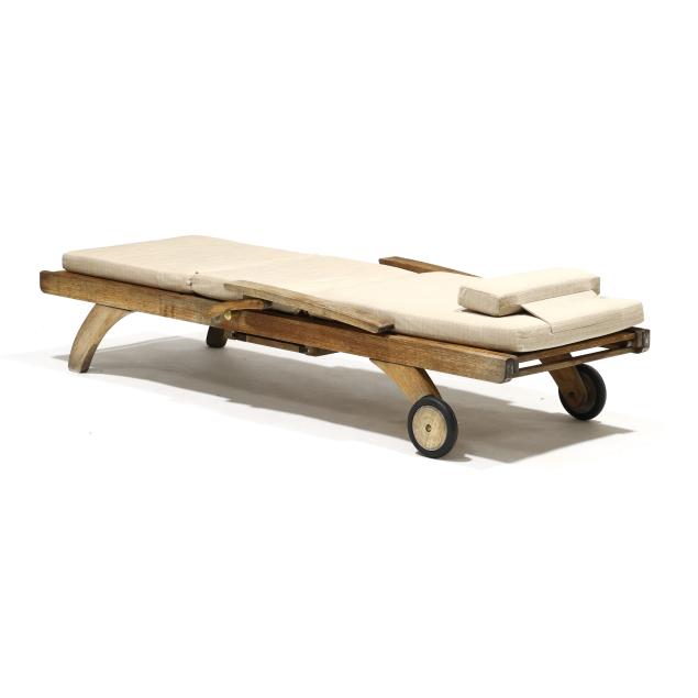 Late 20th century, modern slat form with hinged adjustable back and arms, front rubber wheels, labeled.