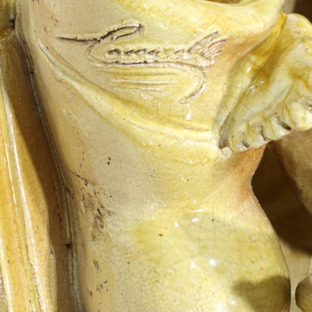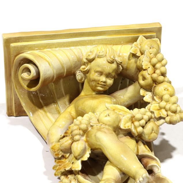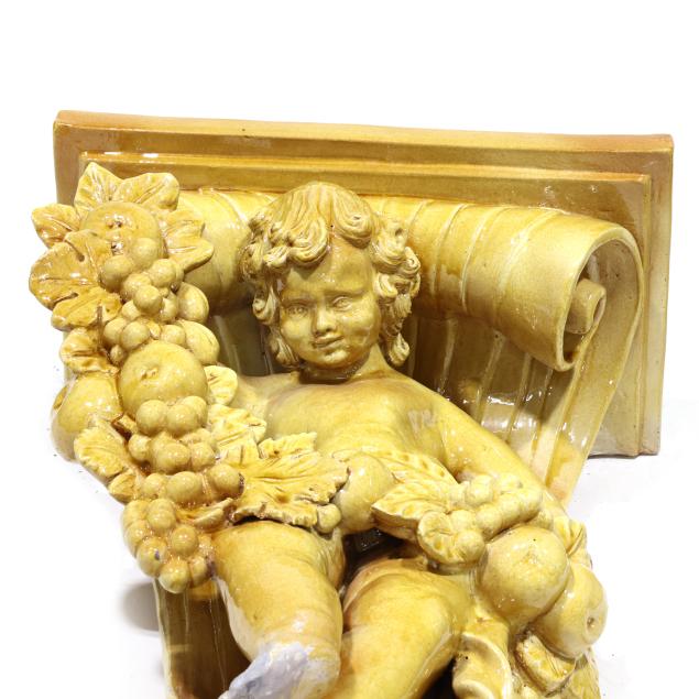 Late 20th century, one part form, yellow crackle glaze, rectangular plinth supported by a boy with fruit garland, signed lower left.