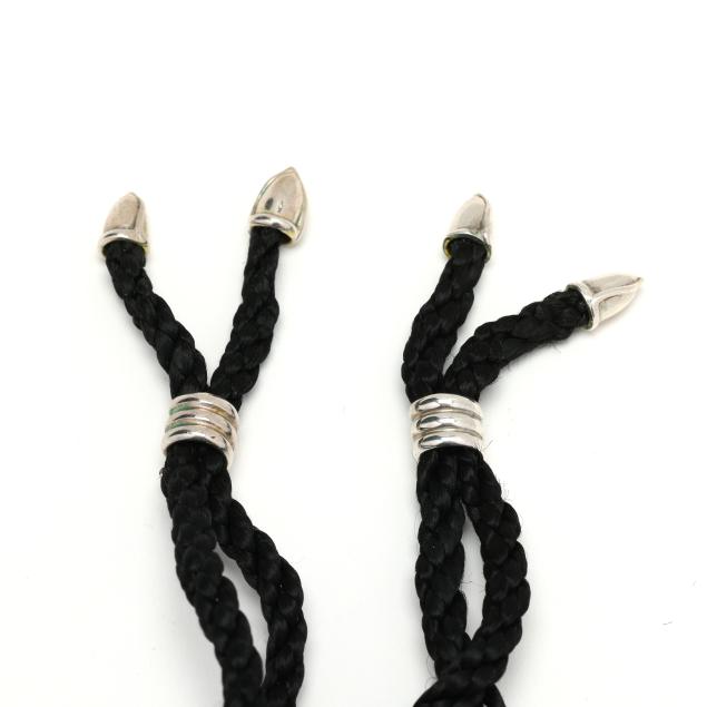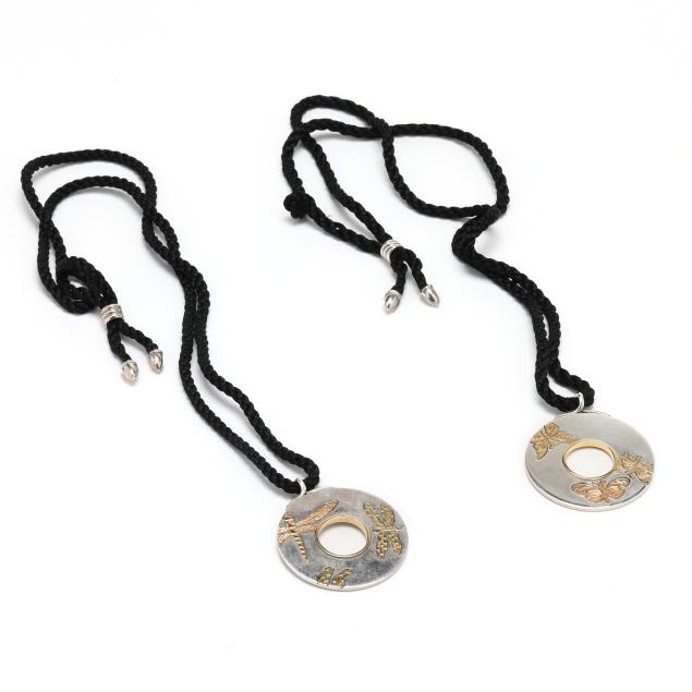 To include: a silver disc pendant with gold butterfly appliqués, signed and stamped 925 750, suspended from a black satin cord necklace with silver fittings (Pendant 2 x 1.75 in.; Necklace 29 in.); and a silver disc pendant with gold dragonfly appliqués, signed and stamped 925 750, suspended from a black black satin cord necklace with silver fittings (Pendant 2 x 1.75 in.; Necklace 29 in.).