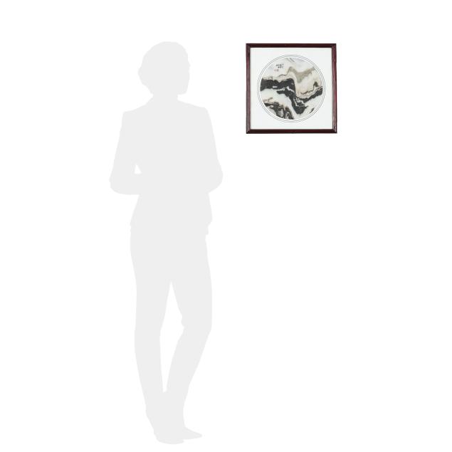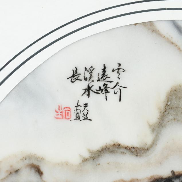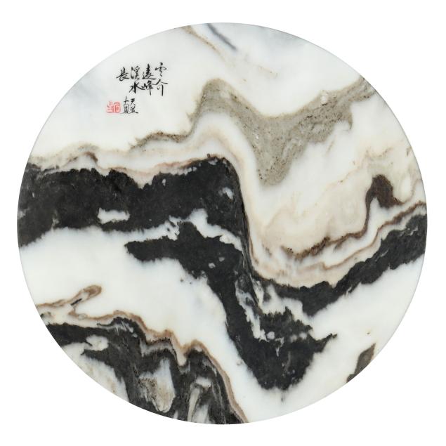 Mid to late 20th century, the marble panel variegated with gray, dark brown and off-white striations forming the illusion of a mountainous landscape, with a poetic inscription about the patterns of the stone evoking water, peak, and bamboo, together with signature and red seal 道金 (Dao Jin), presented under glass with circular mat in a frame.