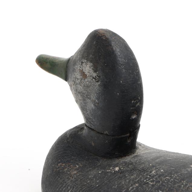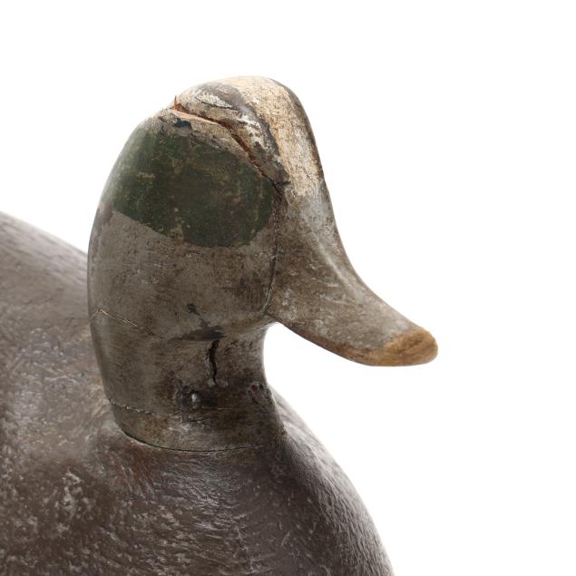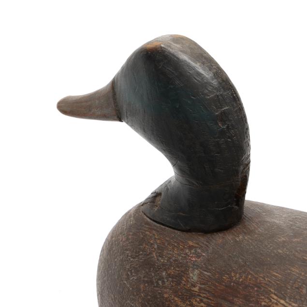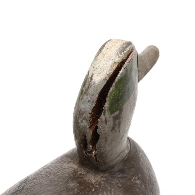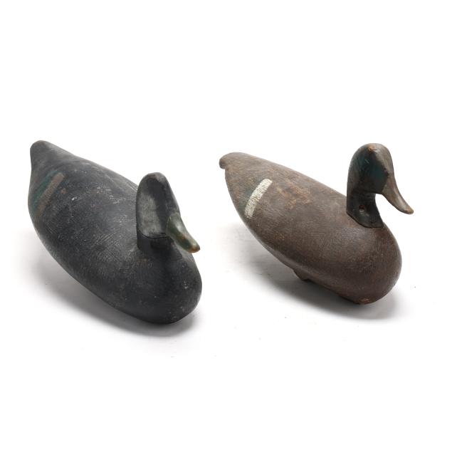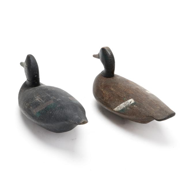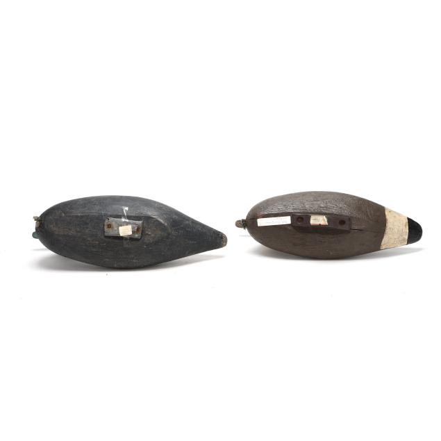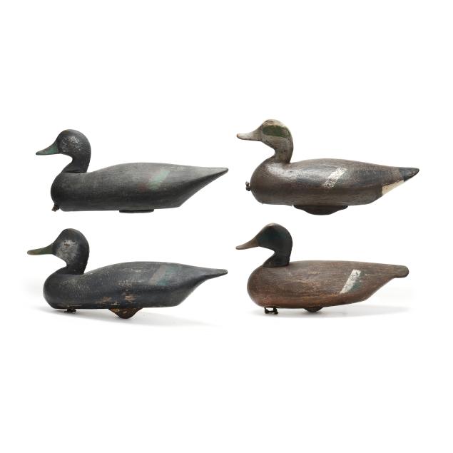 A Ned Burgess widgeon with a significant but stable vertical check in the back of the head, a Ned Burgess redhead repainted as a widgeon, a Ned Burgess decoy painted as a black duck which as a pintail body and redhead head, and a Frank Carter black duck made in the manner of Ned Burgess.